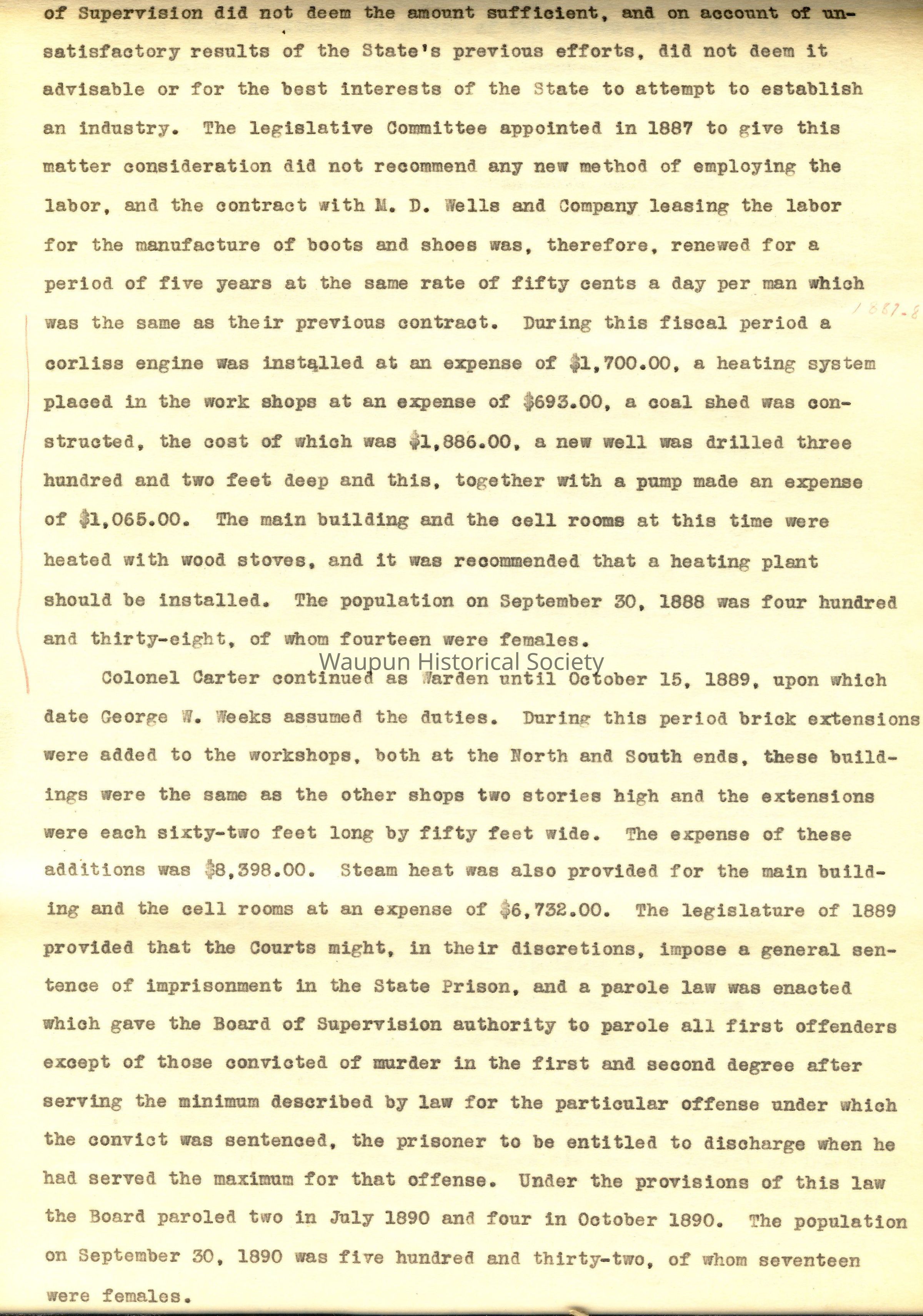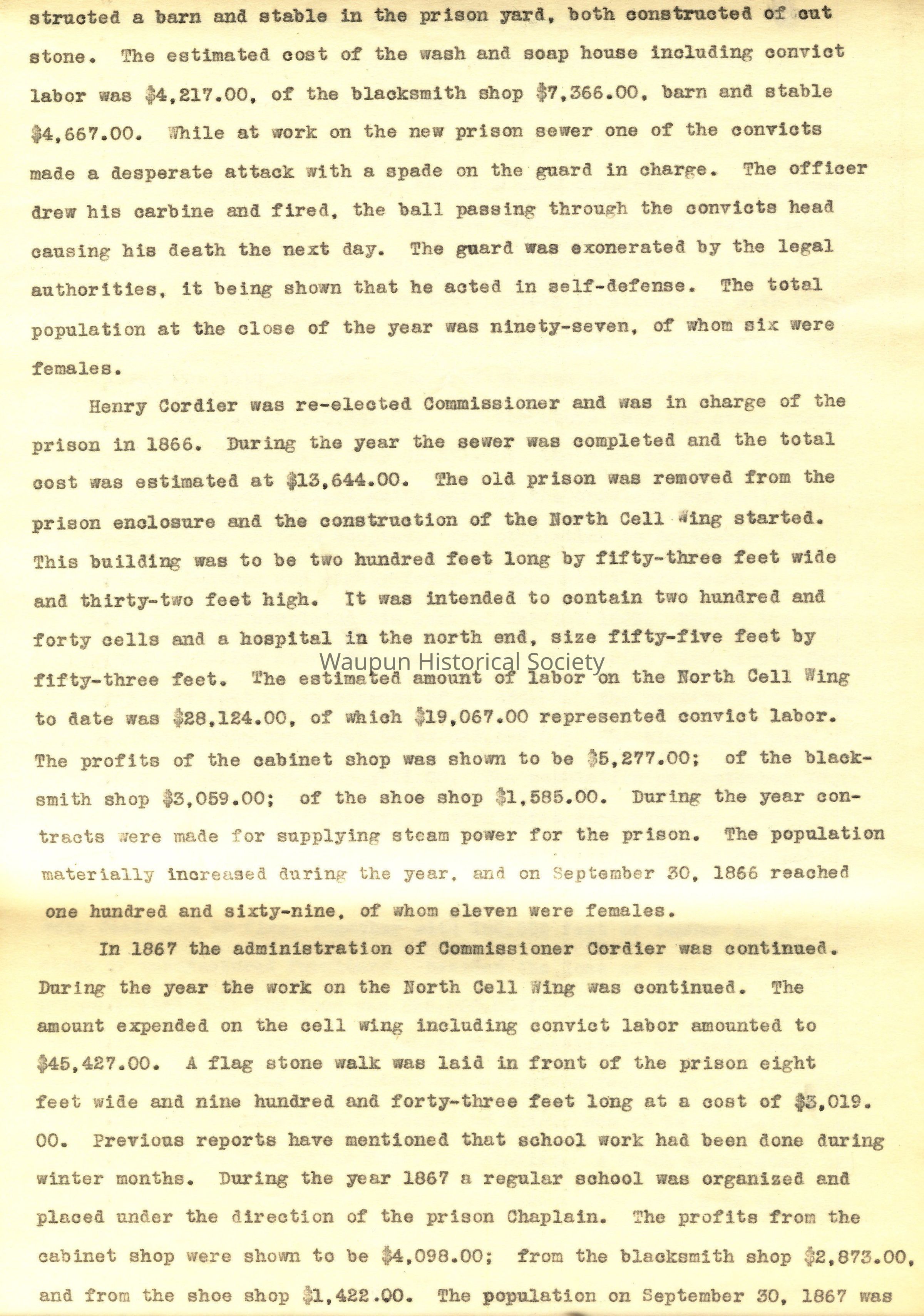 Henry Cordier was re-elected Commissioner and was in charge of the prison in 1866. During the year the sewer was completed and the total cost was estimated at $13,644.00. The old prison was removed from the prison enclosure and the construction of the North Cell Wing started. This building was to be two hundred feet long by fifty-three feet wide and thirty-two feet high. It was intended to contain two hundred and forty cells and a hospital in the north end, size fifty-five feet by fifty-three feet. The estimated amount of labor on the North Cell Wing to date was $28,124.00, of which $19,067.00 represented convict labor. The profits of the cabinet shop was shown to be $5,277.00; of the blacksmith shop $3,059.00; of the shoe shop $1,585.00. During the year contracts .sere made for supplying steam power for the prison. The population materially increased during the year, and on September 30, 1866 reached one hundred and sixty-nine, of whom eleven were females.
