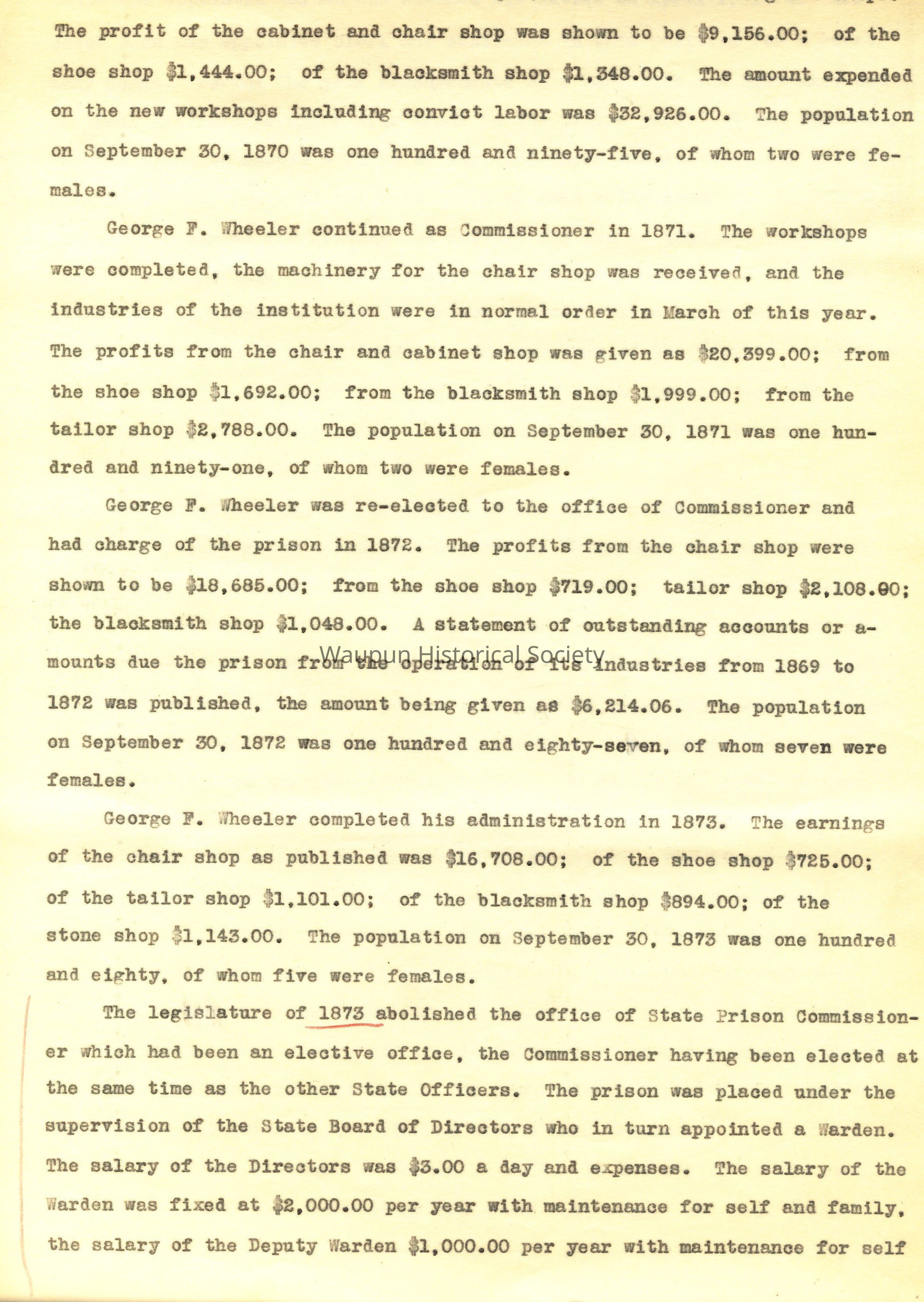 In 1859 the laws were changed so that the Commissioner was required to submit his report as of September 30th. During this period Mr. Hans C. Heg was the Commissioner. During his administration the convict workshops were started. Foundations were dug for a building three hundred and seventy-five feet in length, forty feet wide, divided into four workshops each