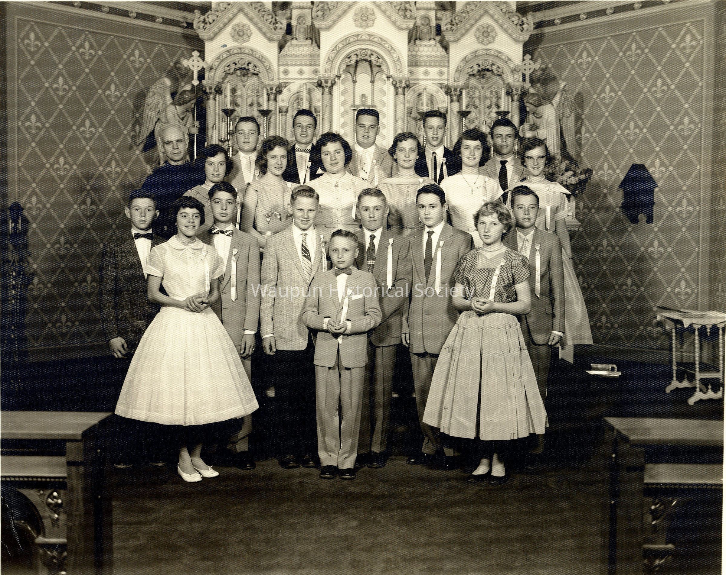 Photograph, Church, St. Joseph Catholic, 1956 Graduating Class. Photo of the June1956 graduating class of St. Joseph Catholic School in Waupun, WI. The History of Waupun Area Schools by Erwin F. Pfefferkorn indicates that St. Joseph school operated as a grade from 1951 to 1968. In 1966 they discontinued 7 & 8th grade and in 1970 they discountinued grades 1-6. See 2009.0500.0061. Row 1 from L to R: Margie Oechsner, ???, ???. Row 2 from L to R: Jim Spanbauer, ???, ???, Joseph Kluz, Lornie Indermuehle, ???. Row 3 from L to R: Jeannie VanHierden, Marne Wilson, Connie West, Mary Albert, Mary Long and Sarah Stephenson. Row 4 from L to R: Jim Shaw, Tom Kaminski, Pete Richter, ???, and Tom Ellman. The priest is Mathias Schnieders, OFM, Conv.