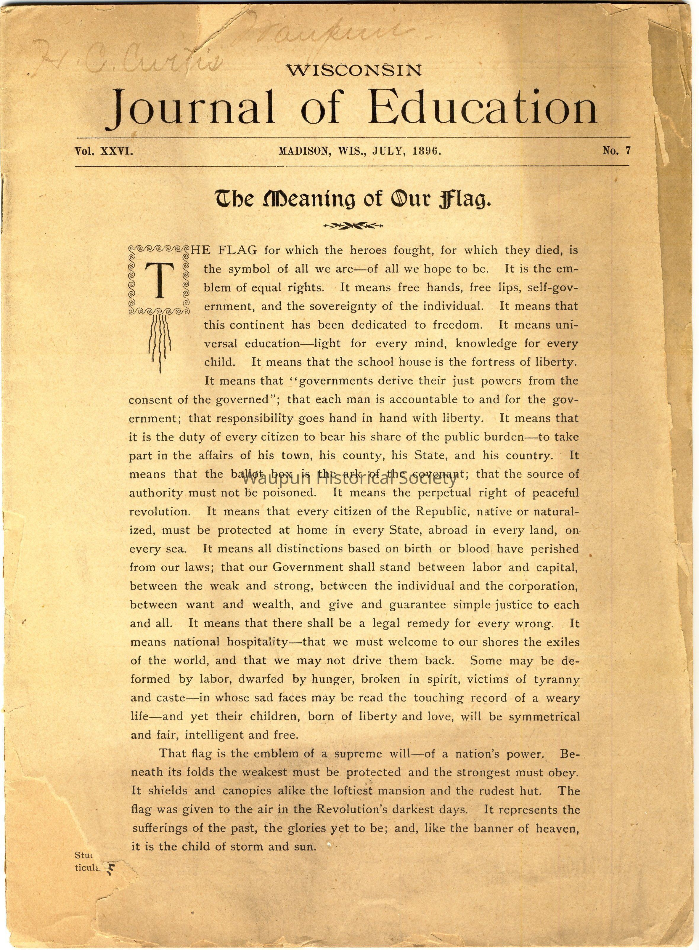 Booklet - Wisconsin Journal of Education, Vol. XXVL, Madison, Wis., July, 1896, No. 7. The name H. C. Curtis, Waupun is handwritten in pencil on the top of front page.