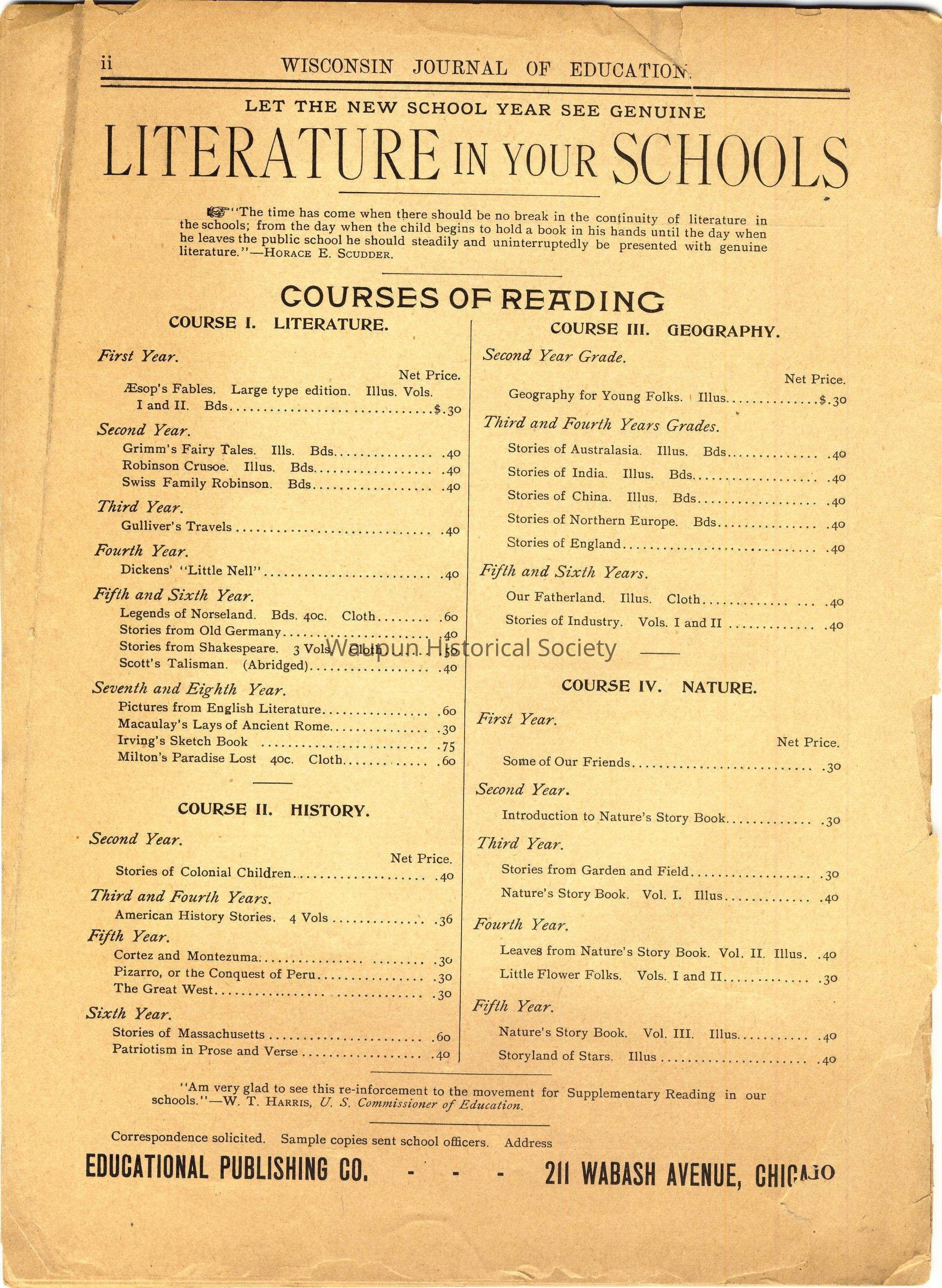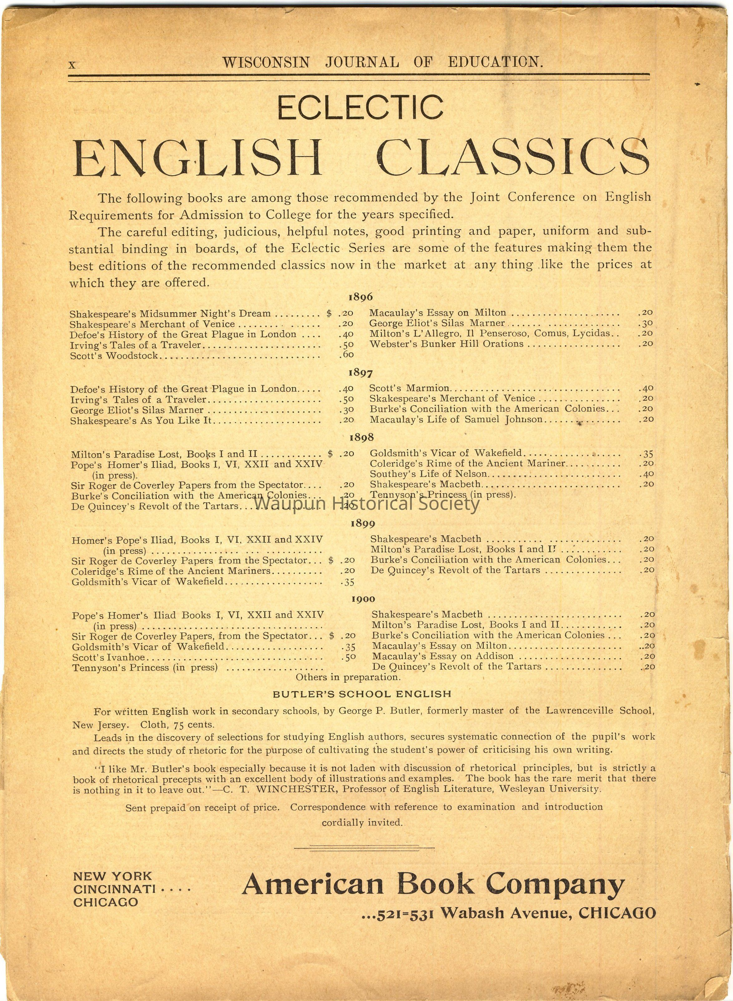 Back page has Eclectic English Classics books along with prices, listed for 1896, 1897, 1898, 1899, and 1900.Acquisition