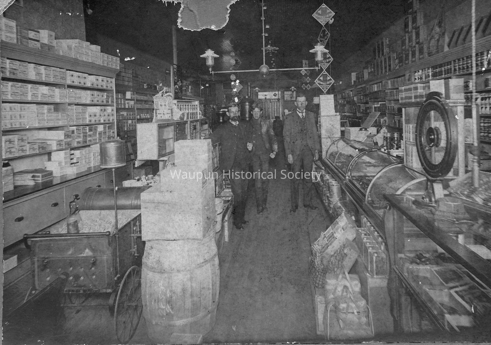 Fuss Brothers Grocery Store. The interior of the Fuss Brothers Grocery Store. Written on the back of the photo it indicates: On left facing: Otto Fuss, Center Unknown, On right Will Fuss.