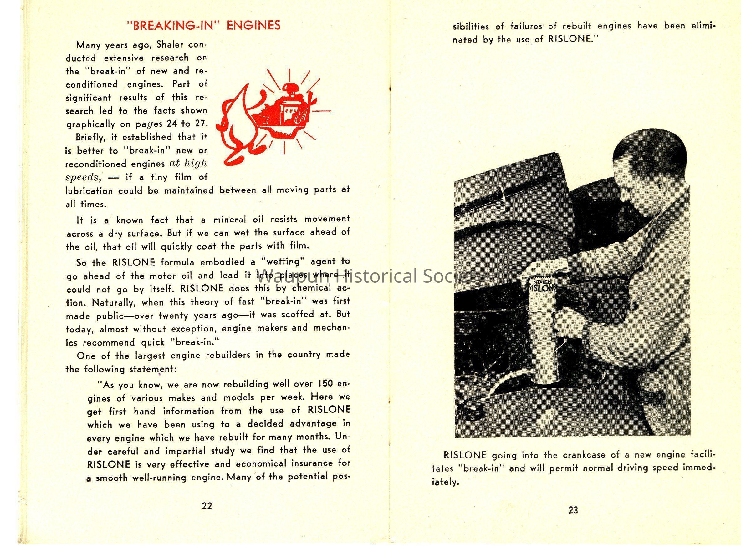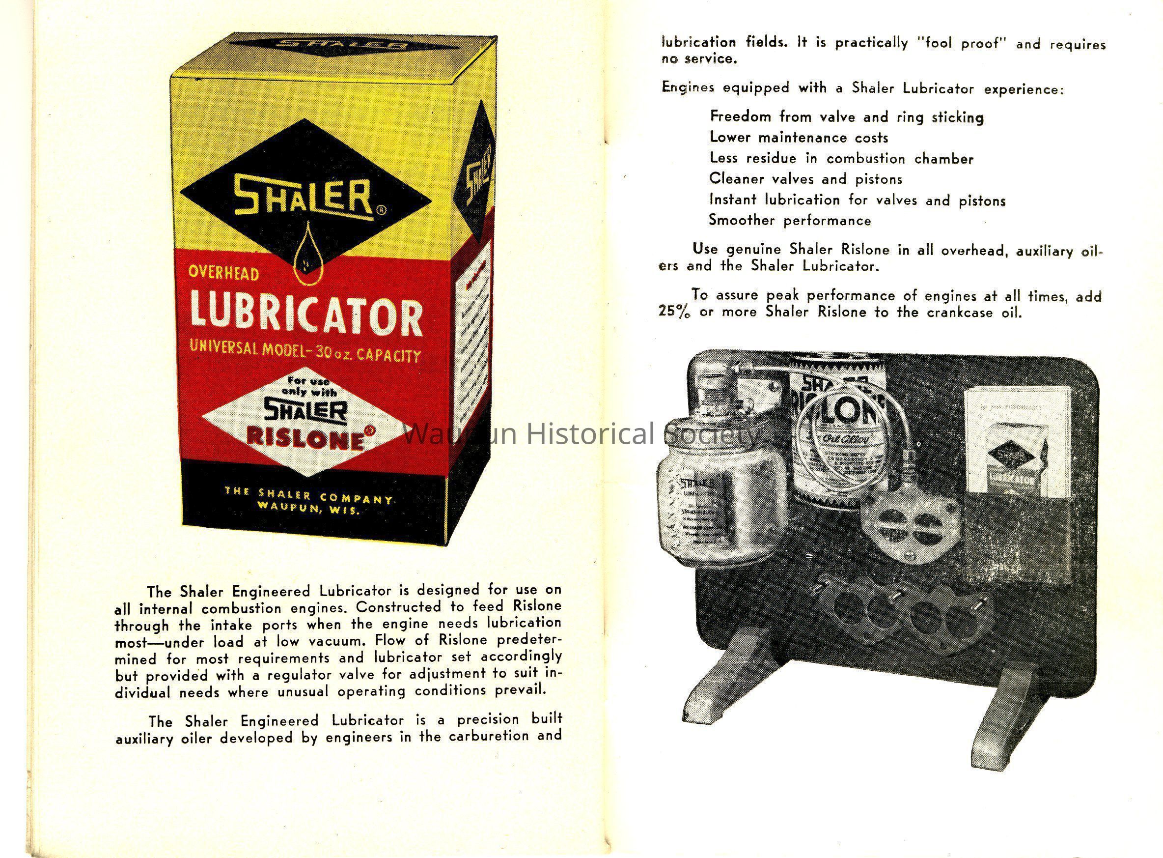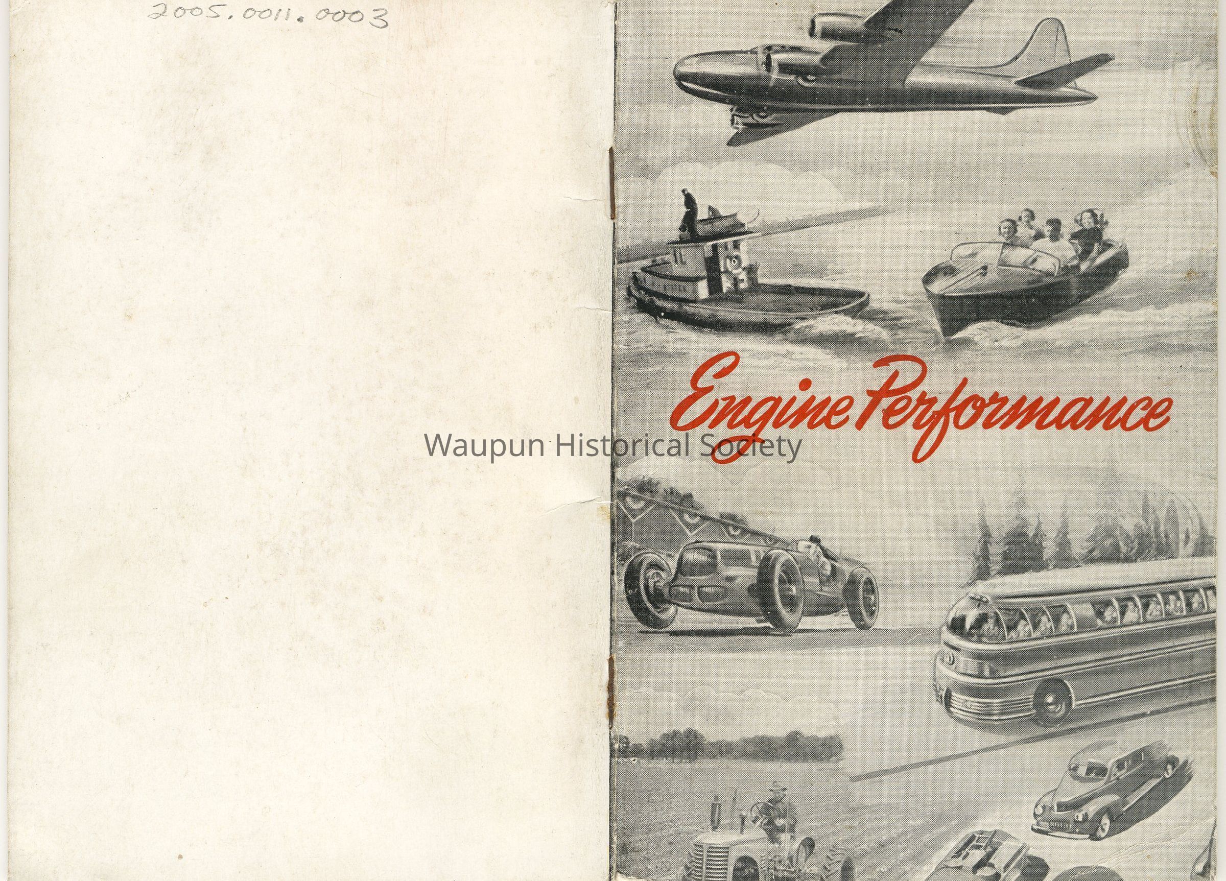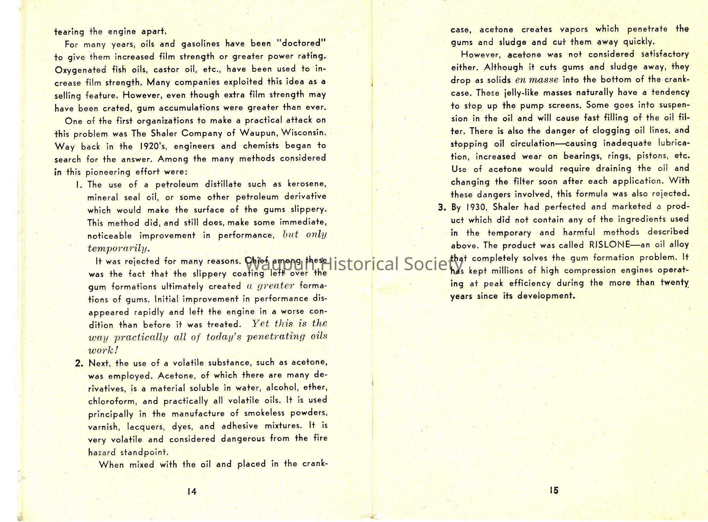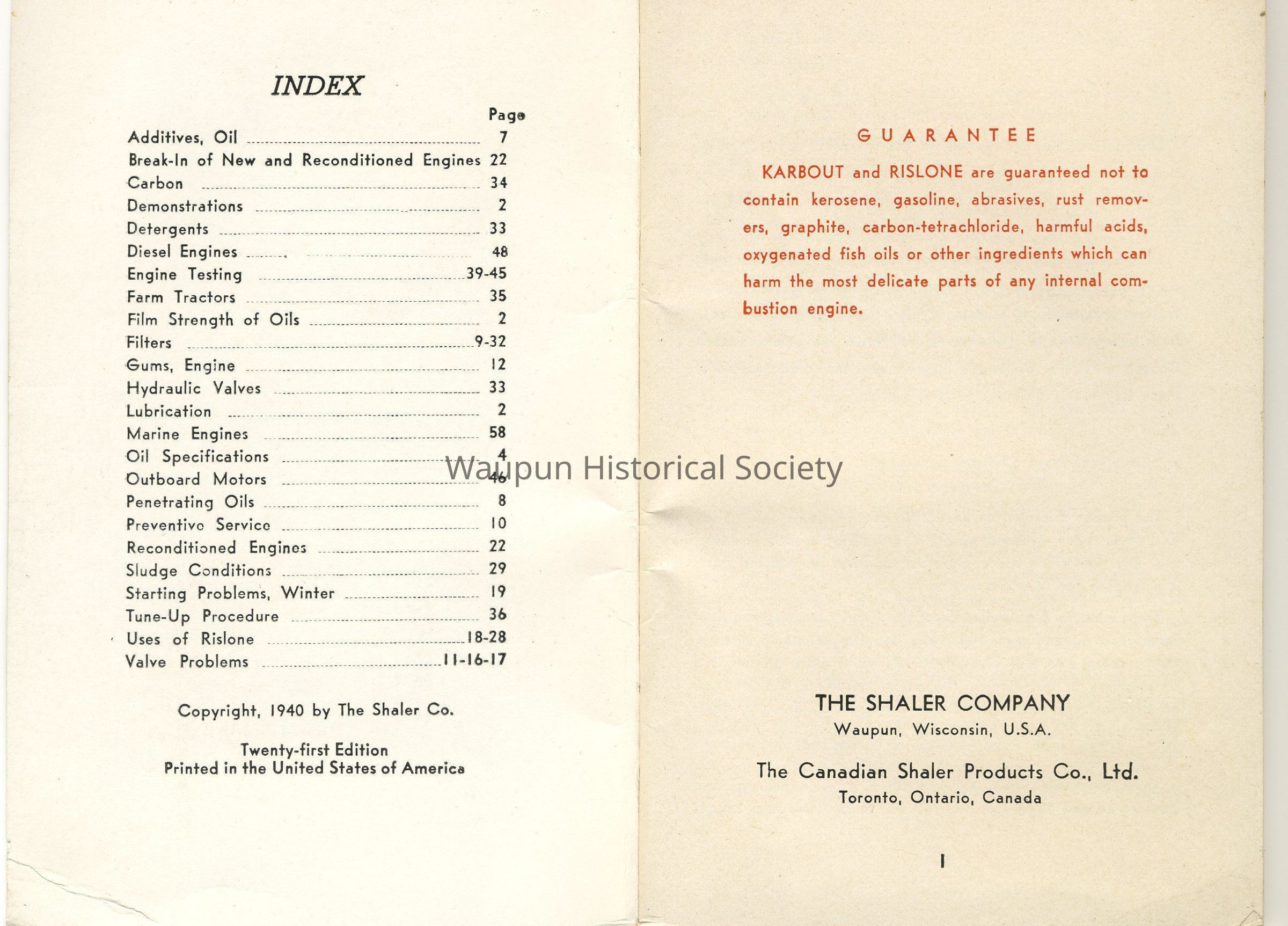 Informative booklet copyrighted by the Shaler Company of Waupun in 1940, entitled "Engine Performance" Included are the Karbout & Rislone Guarantees and several chapters on oil and various engines. There are two copies, one on display, the other stored with the photo collection.Acquisition