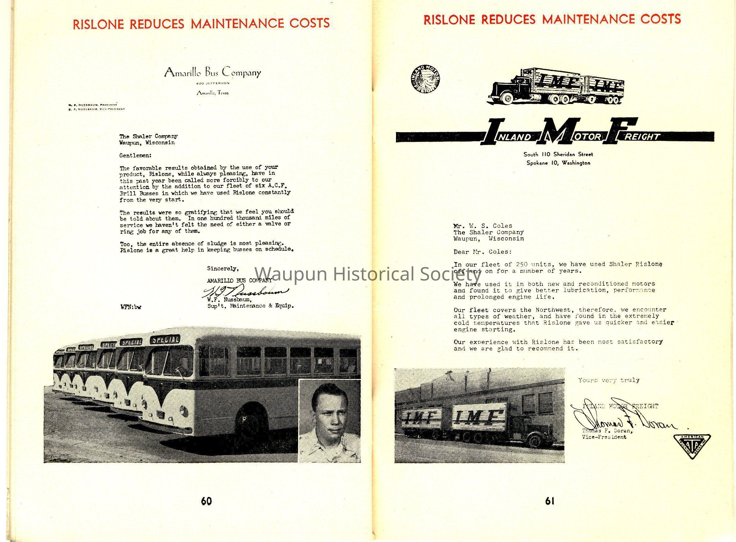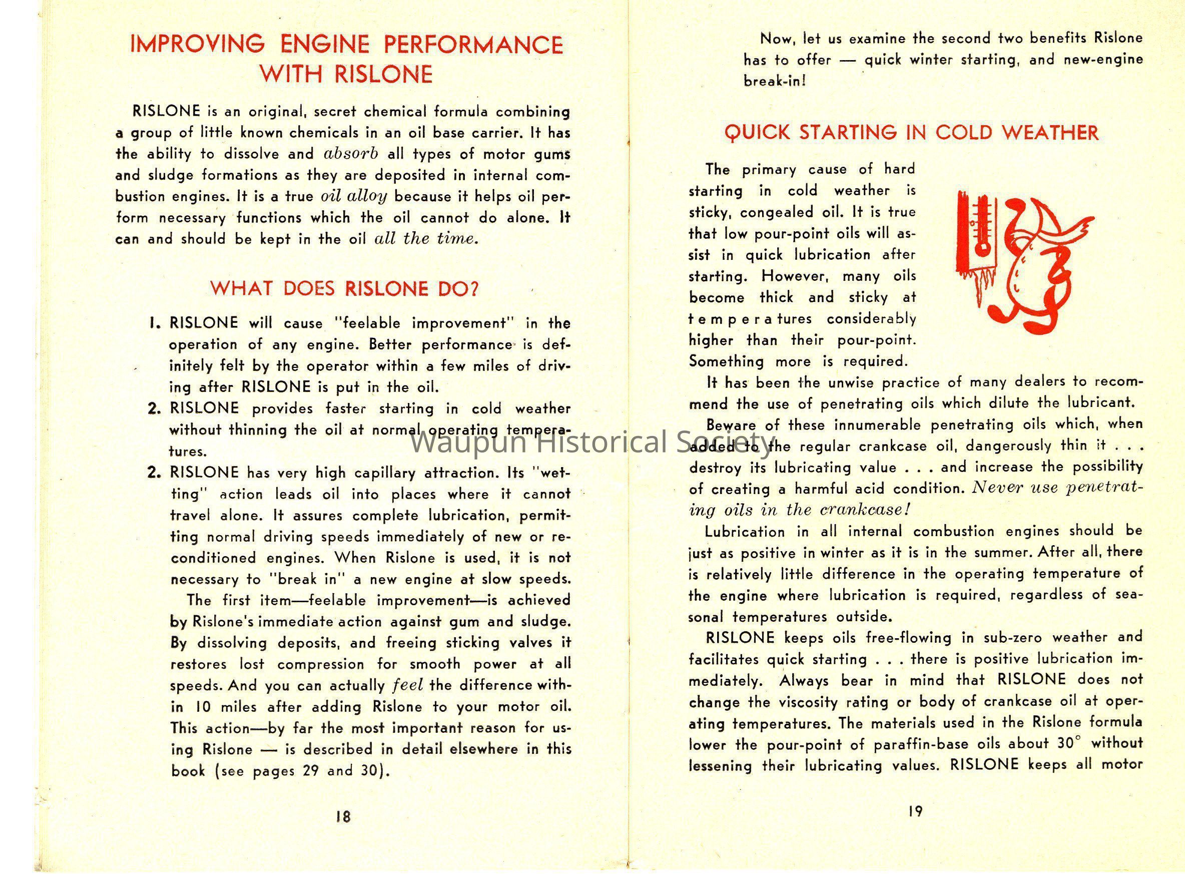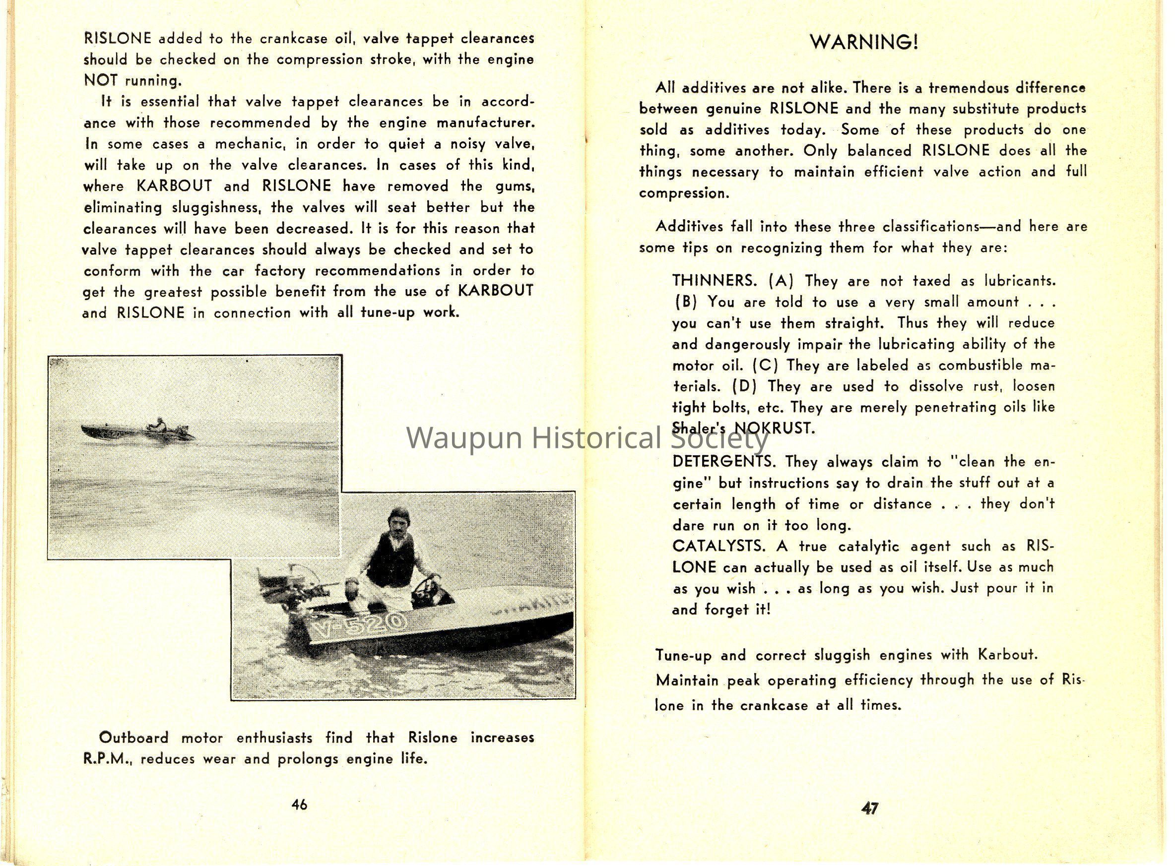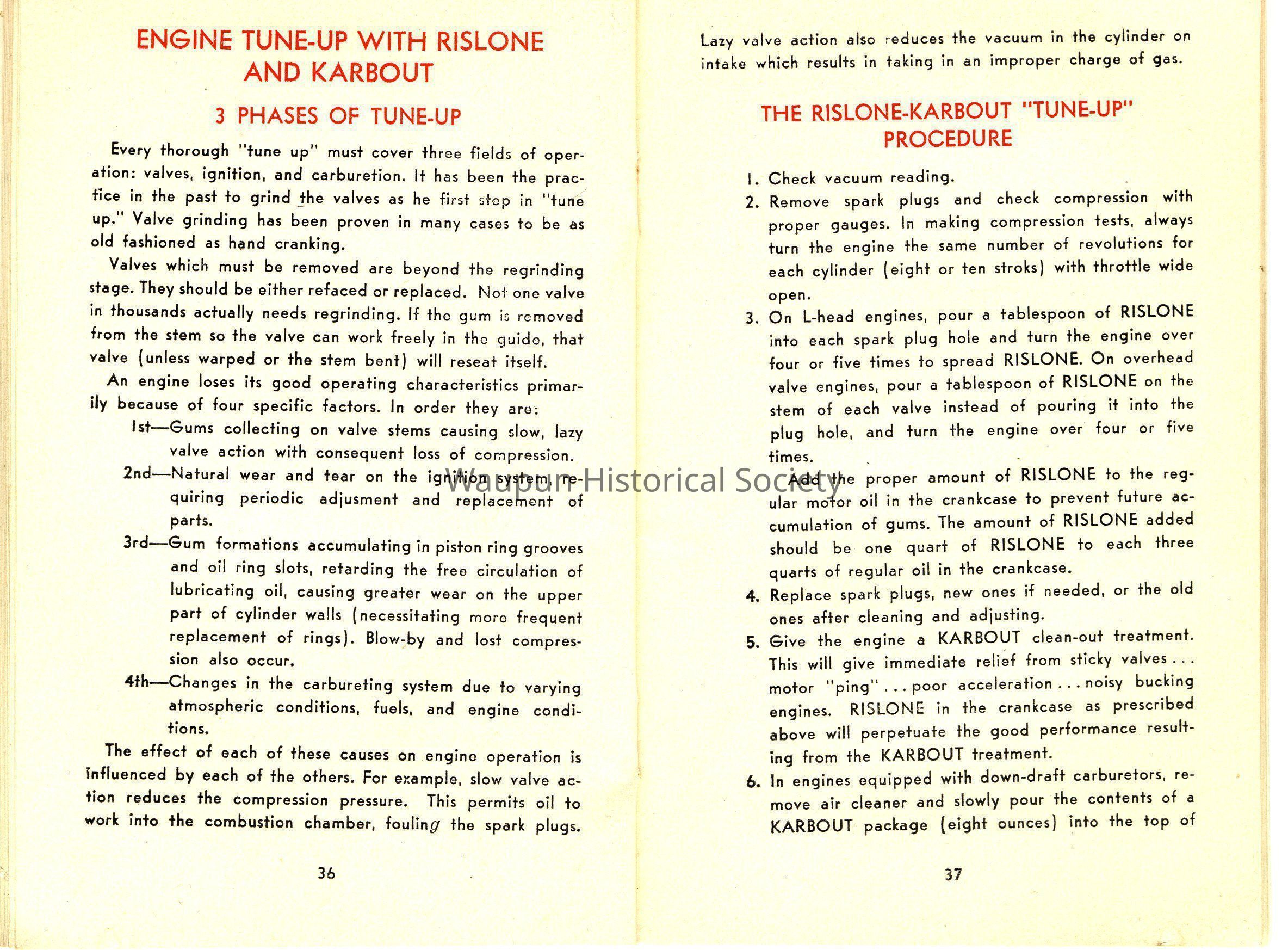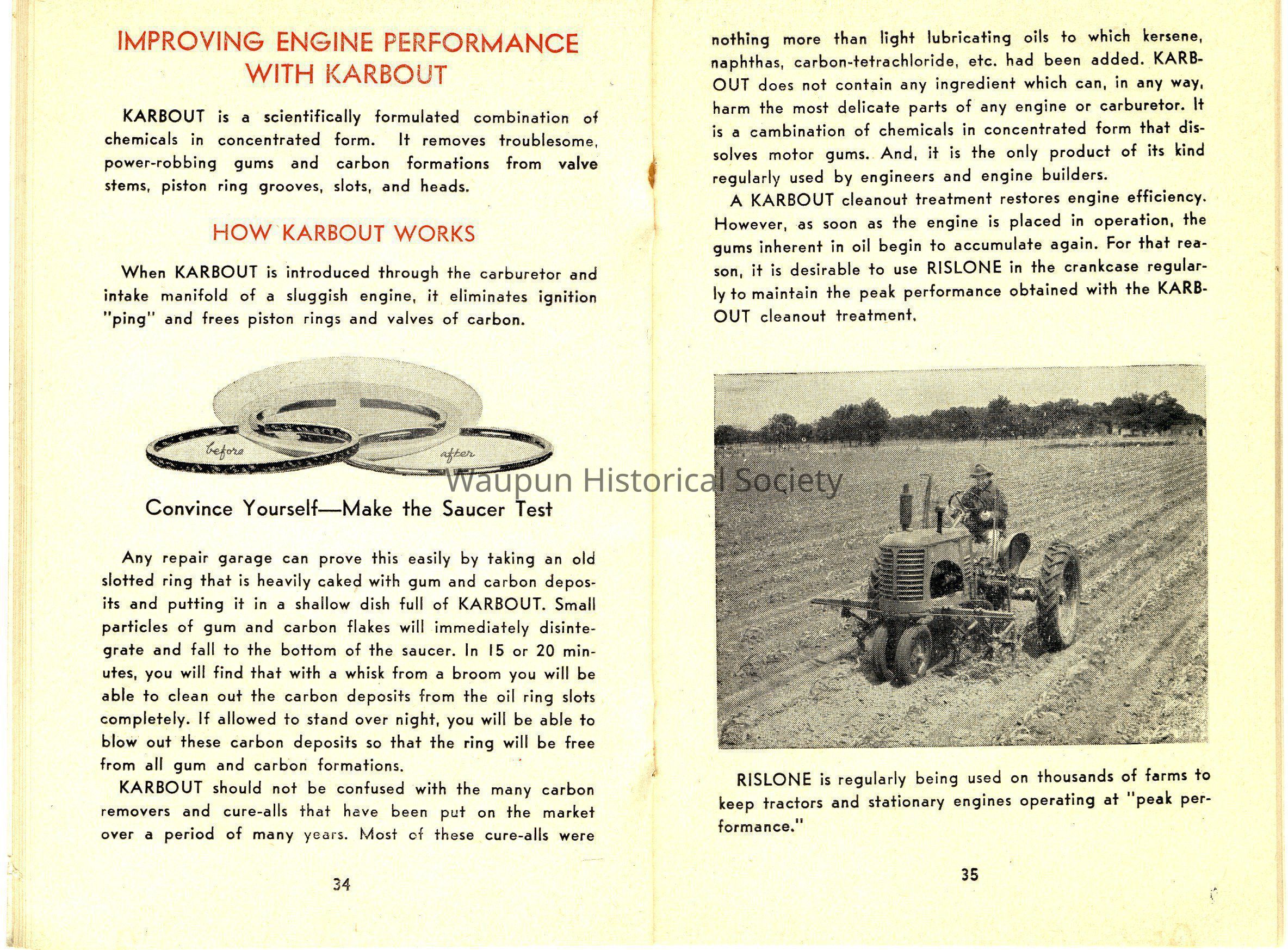 Informative booklet copyrighted by the Shaler Company of Waupun in 1940, entitled "Engine Performance" Included are the Karbout & Rislone Guarantees and several chapters on oil and various engines. There are two copies, one on display, the other stored with the photo collection.Acquisition