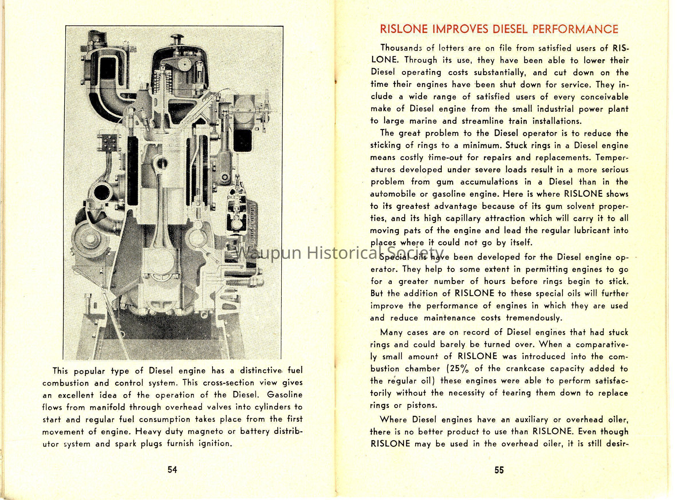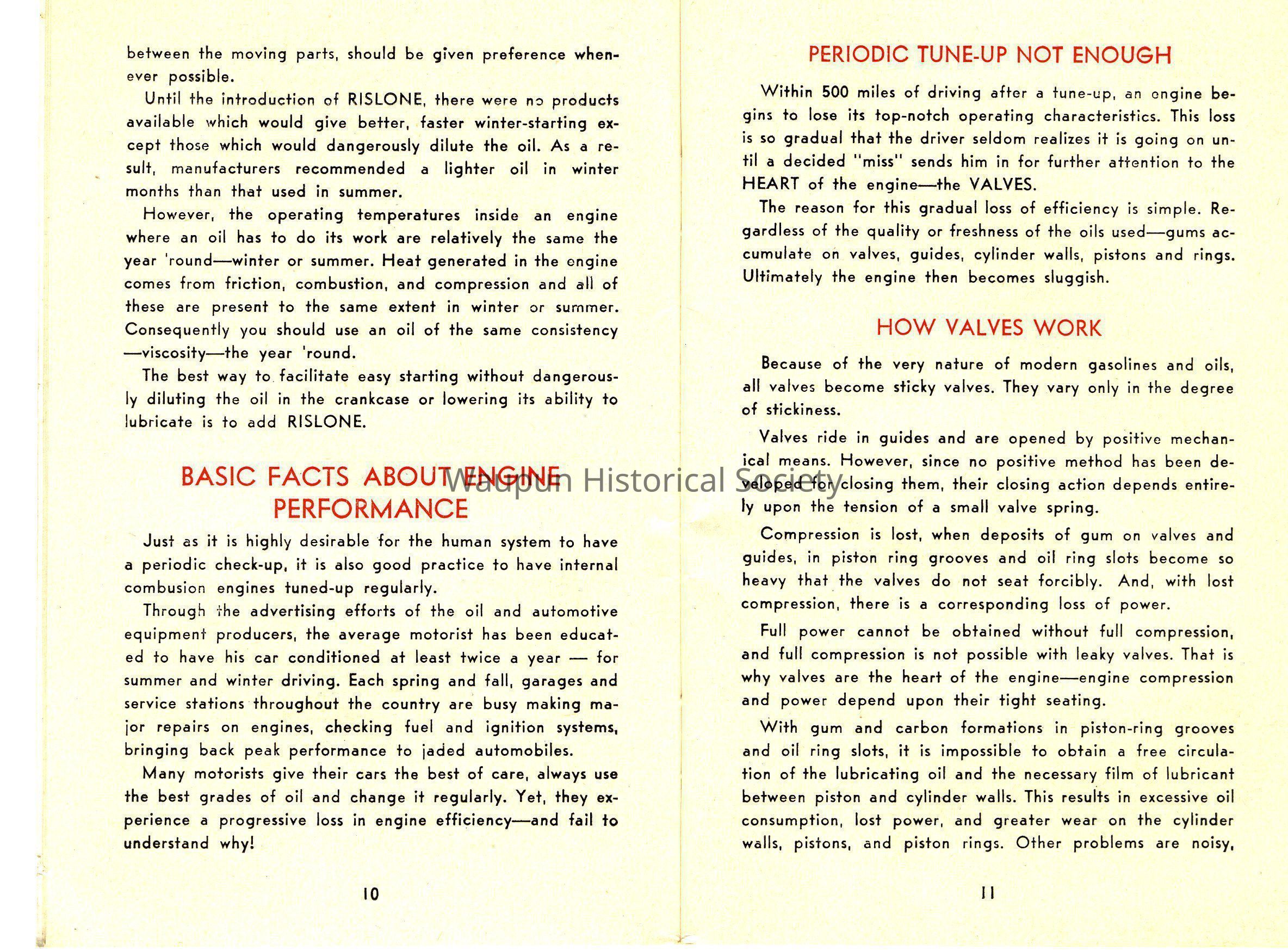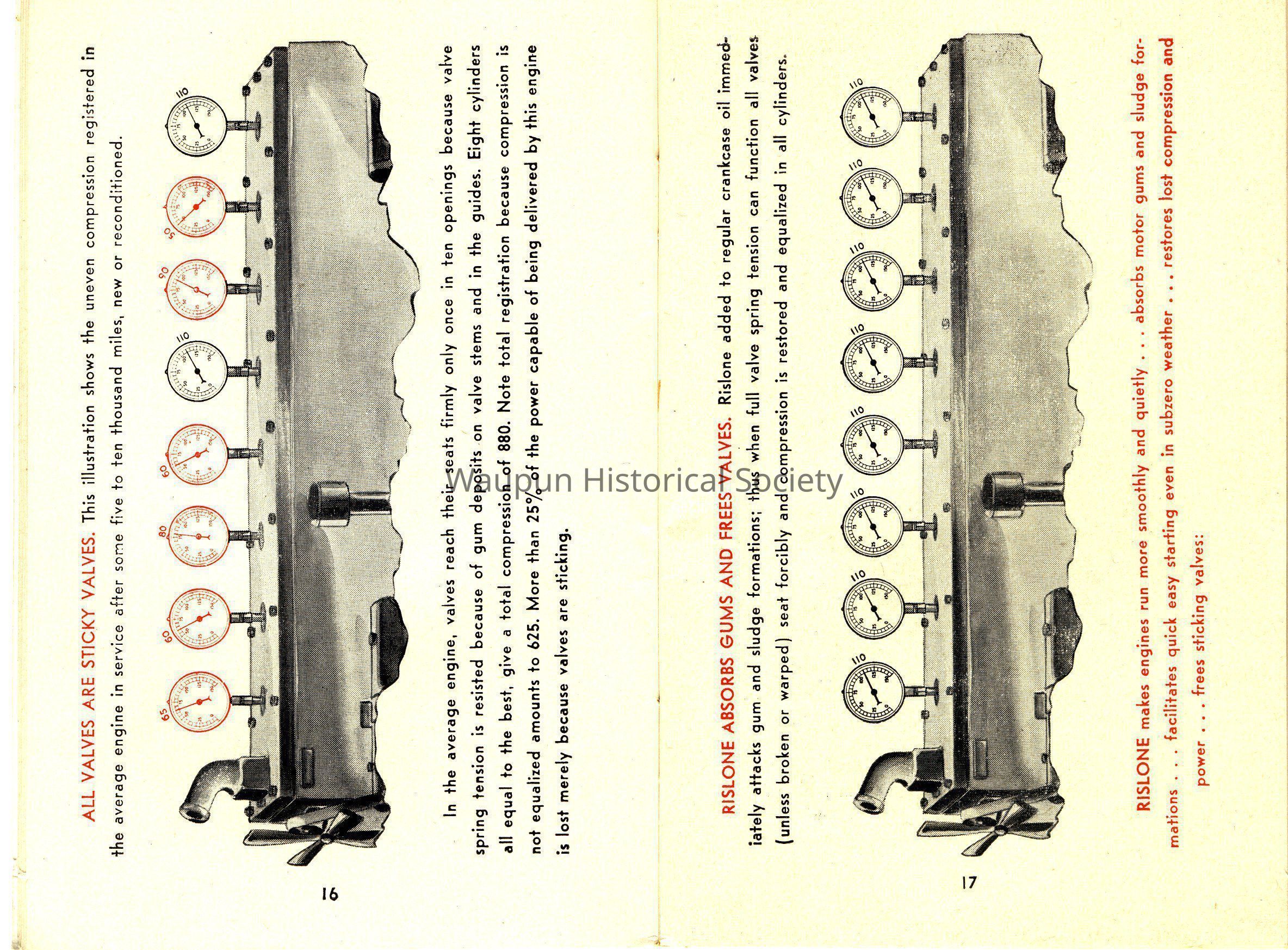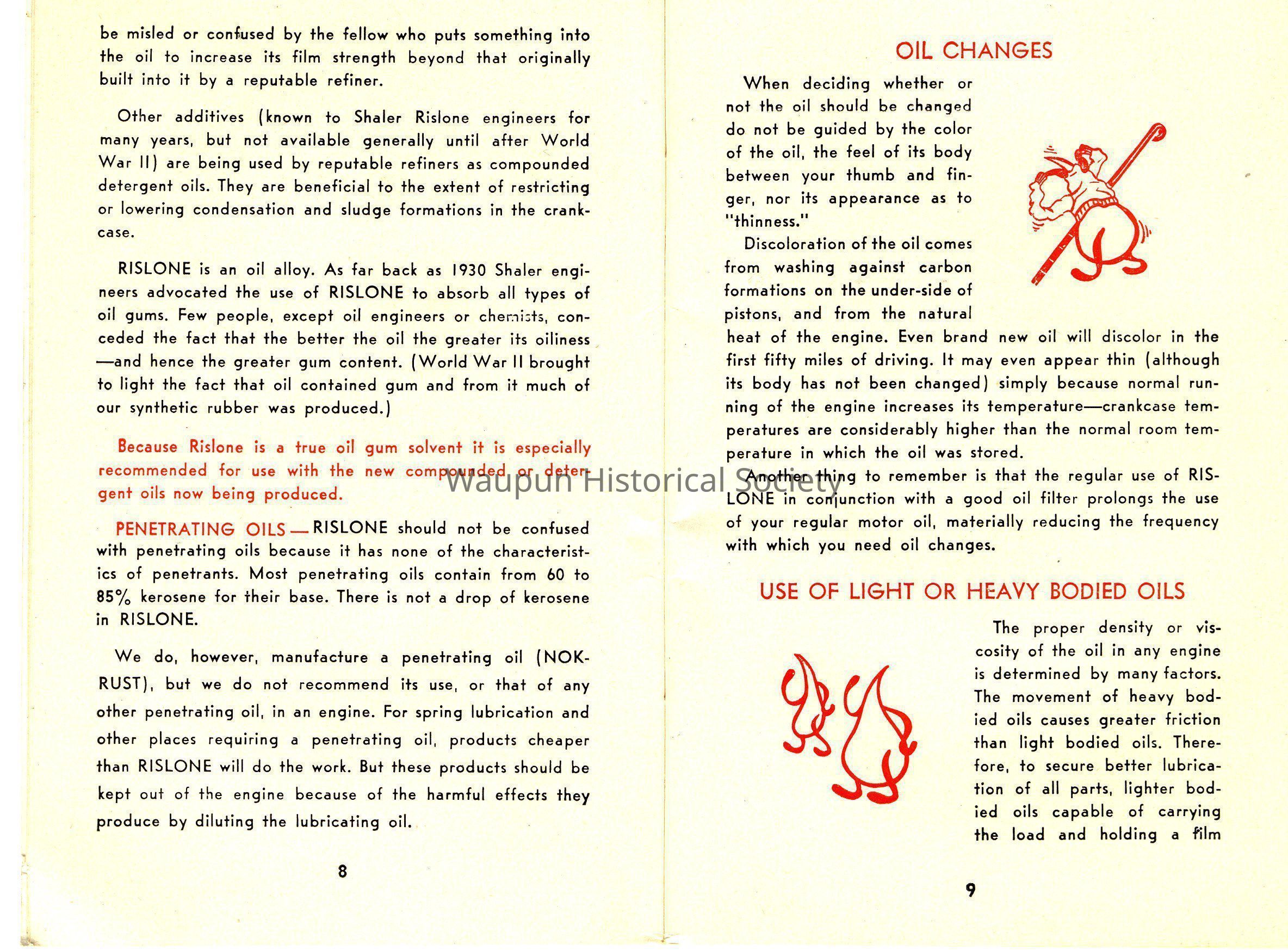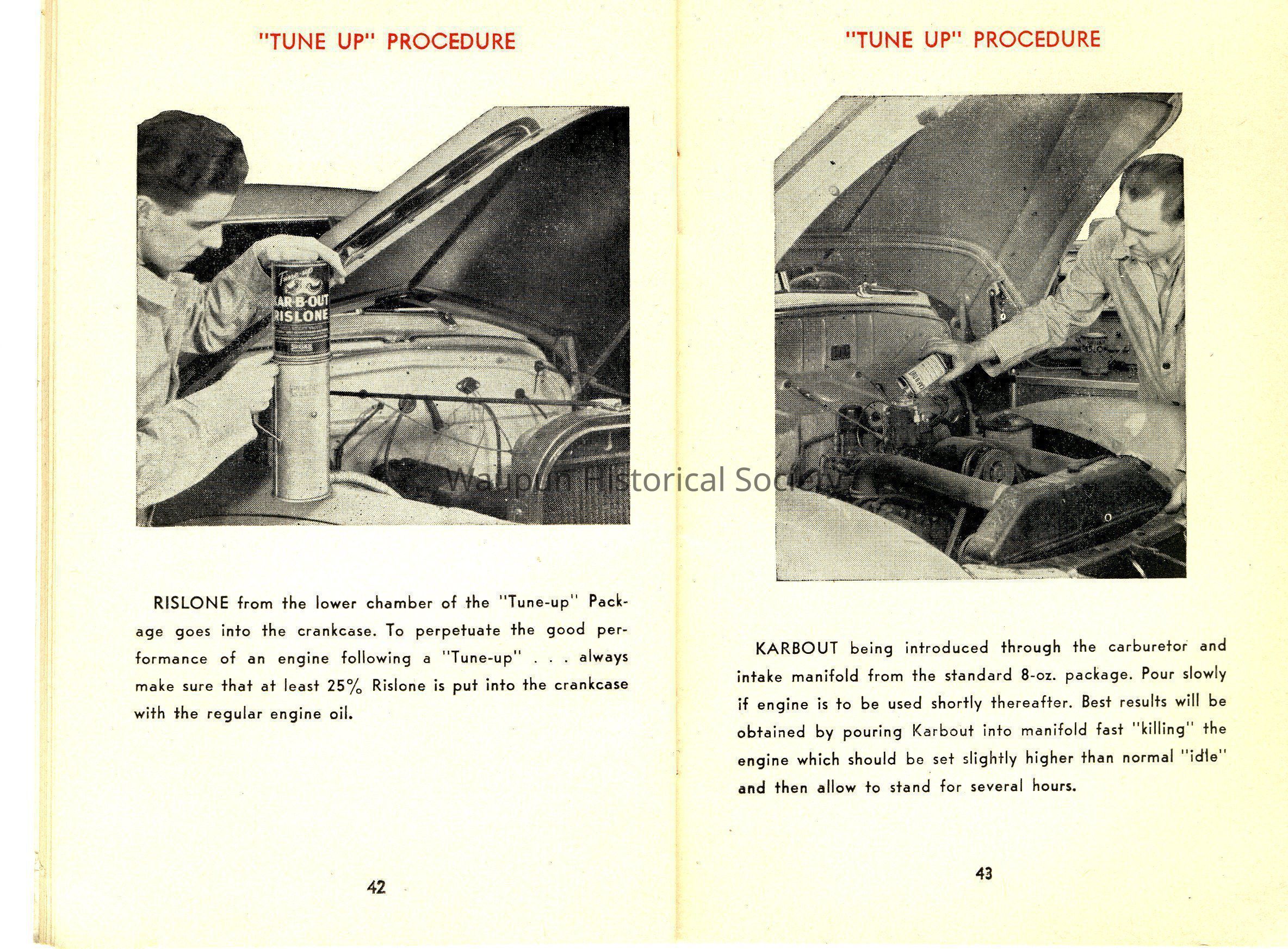 Informative booklet copyrighted by the Shaler Company of Waupun in 1940, entitled "Engine Performance" Included are the Karbout & Rislone Guarantees and several chapters on oil and various engines. There are two copies, one on display, the other stored with the photo collection.Acquisition
