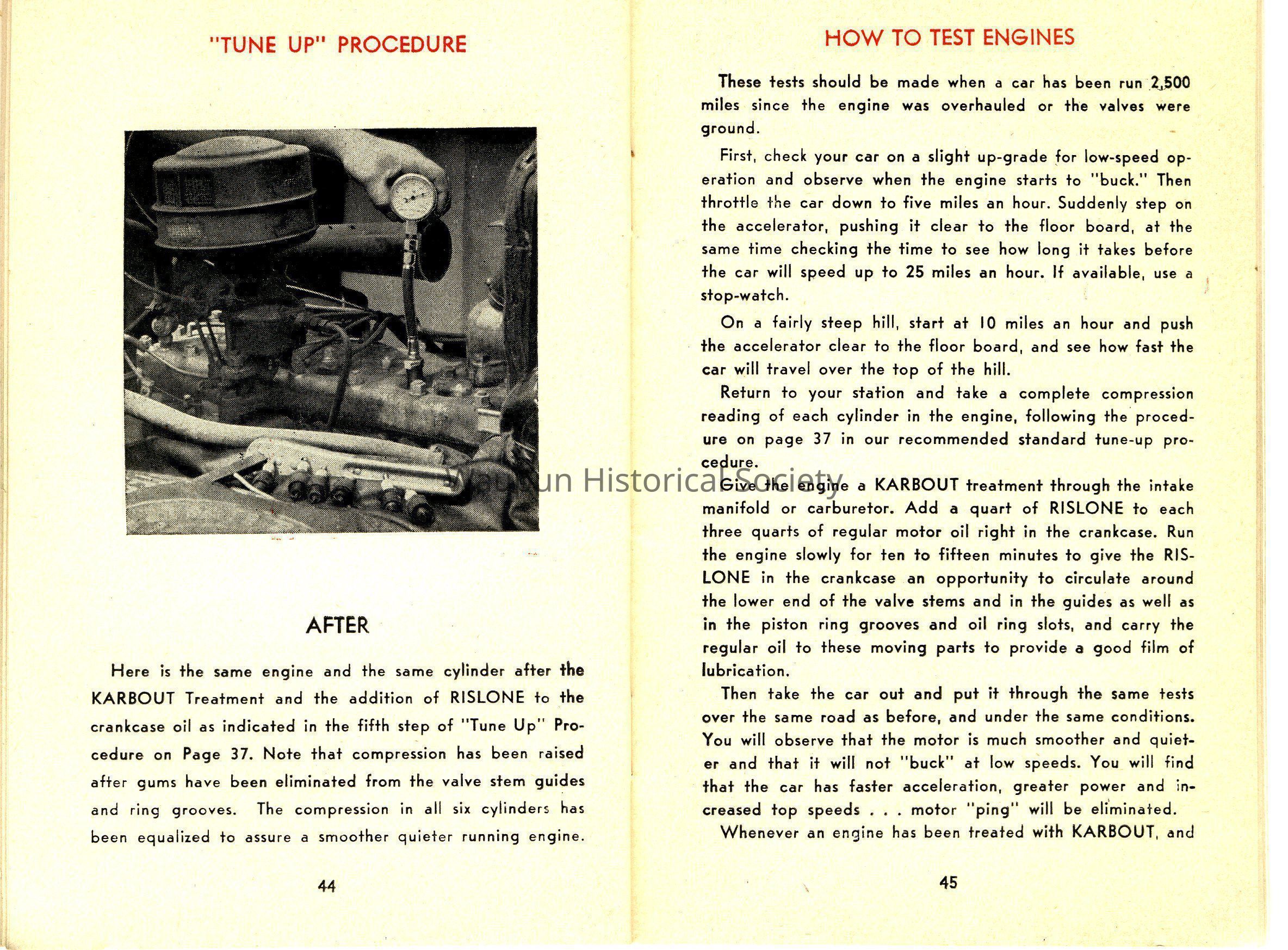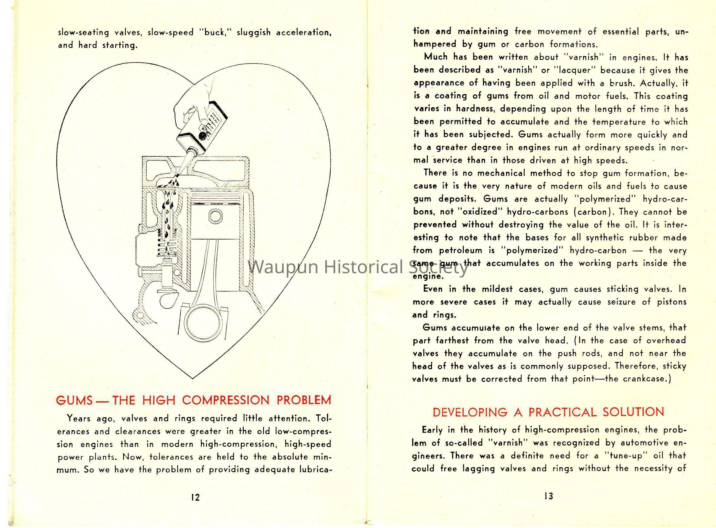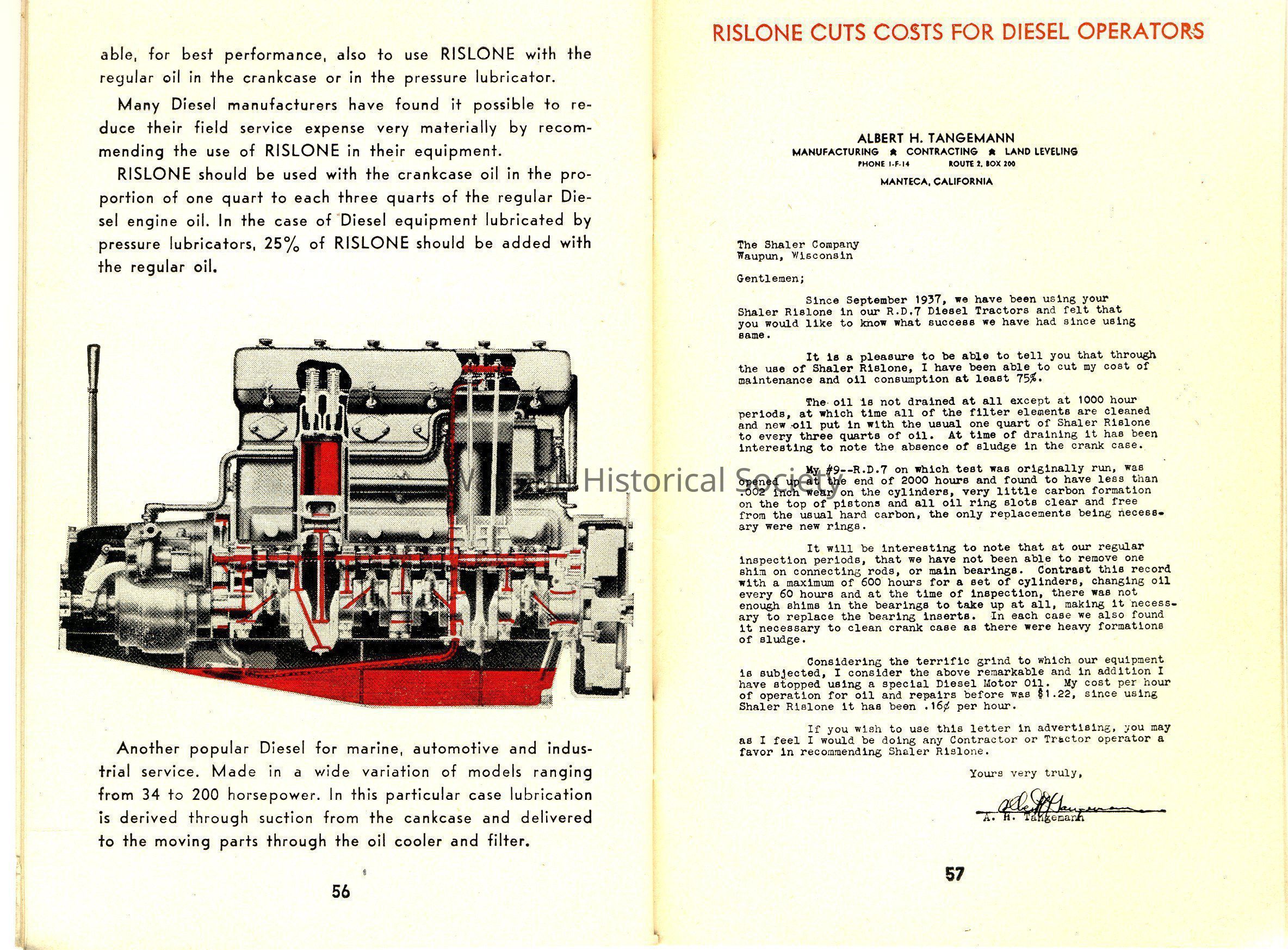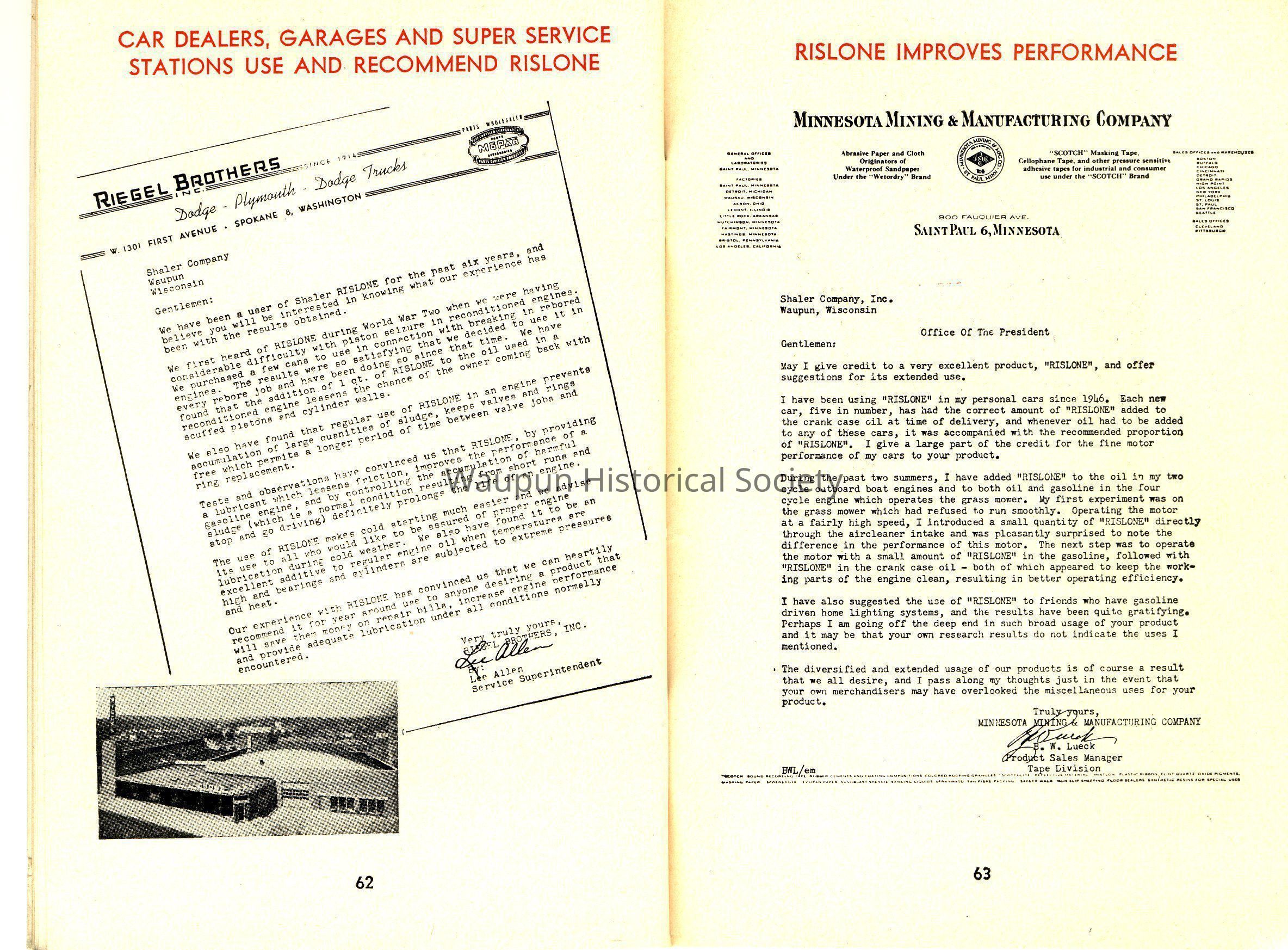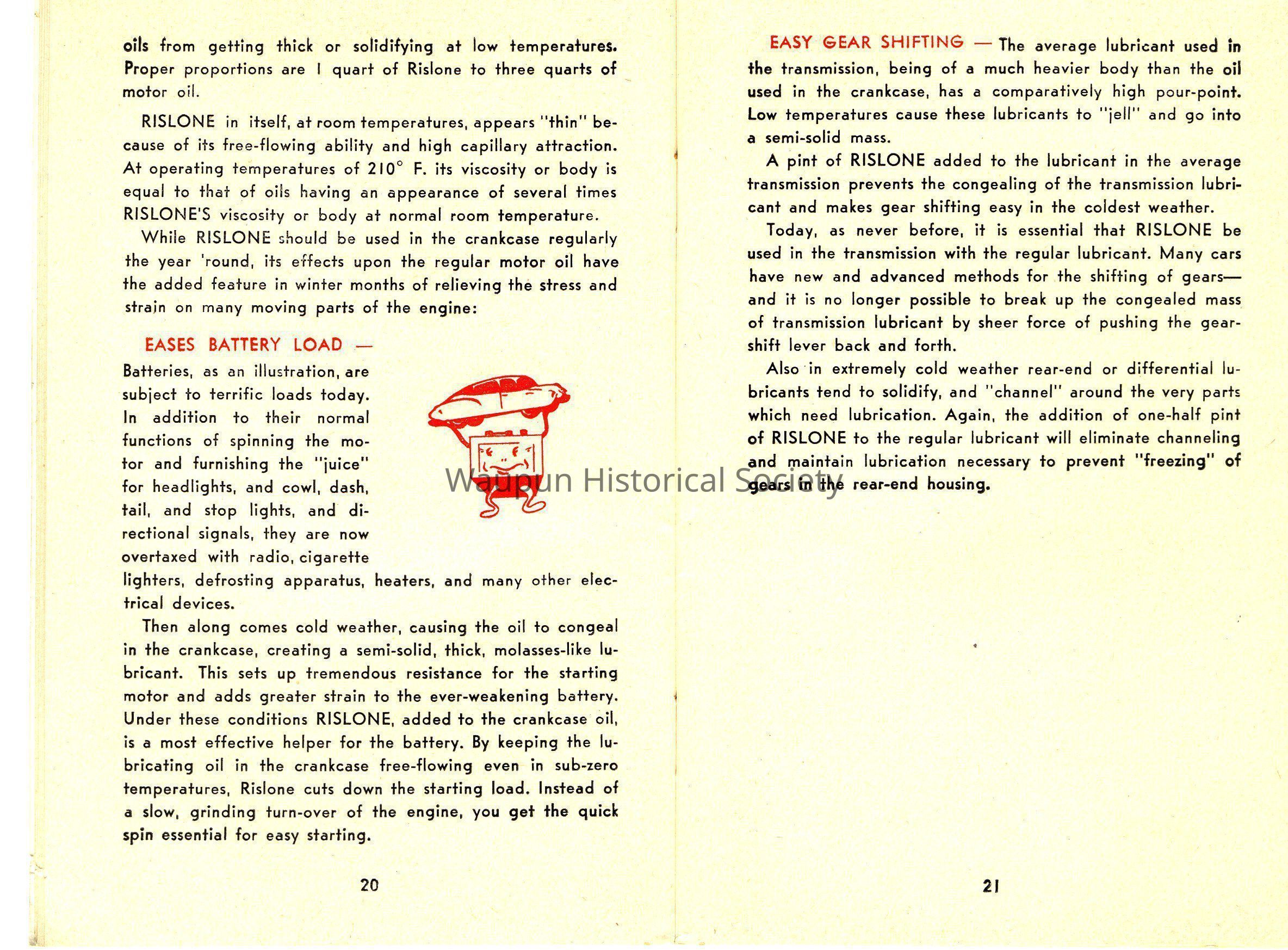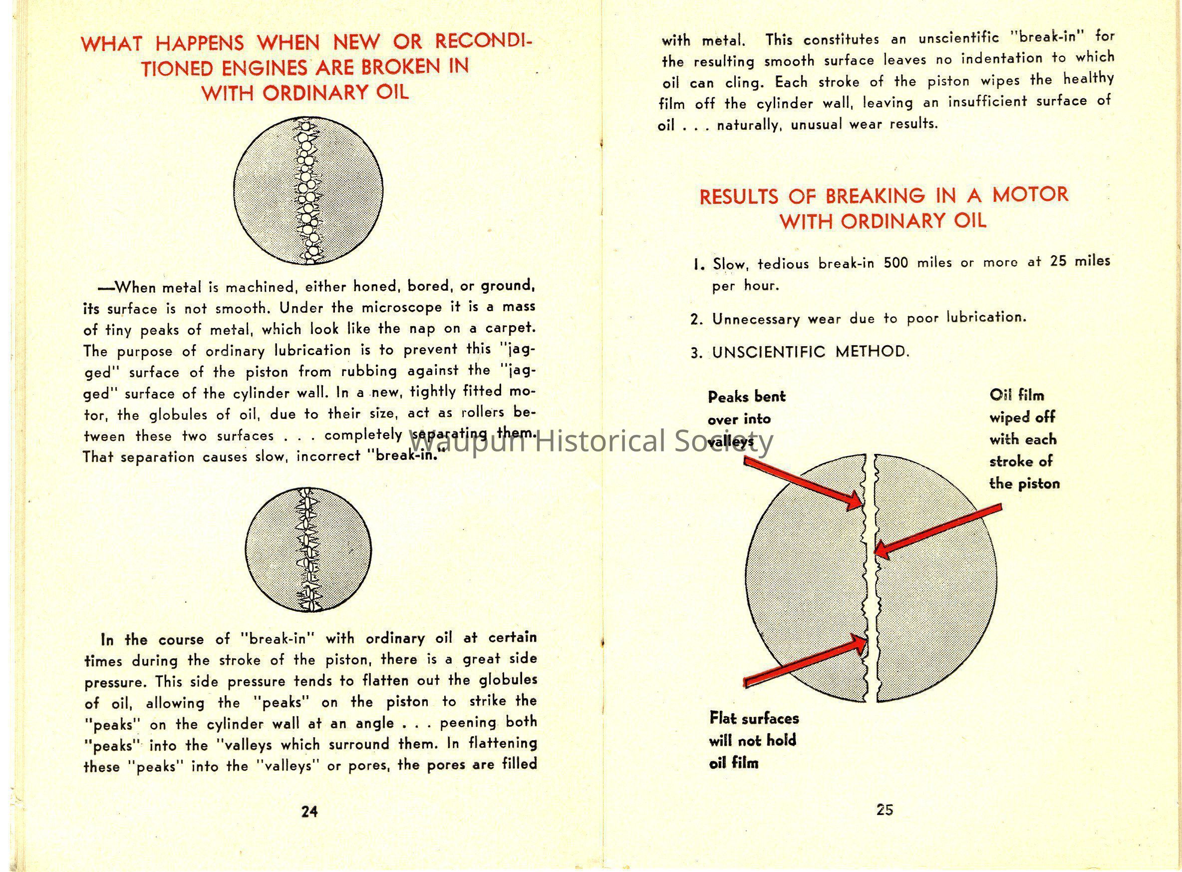 Informative booklet copyrighted by the Shaler Company of Waupun in 1940, entitled "Engine Performance" Included are the Karbout & Rislone Guarantees and several chapters on oil and various engines. There are two copies, one on display, the other stored with the photo collection.Acquisition