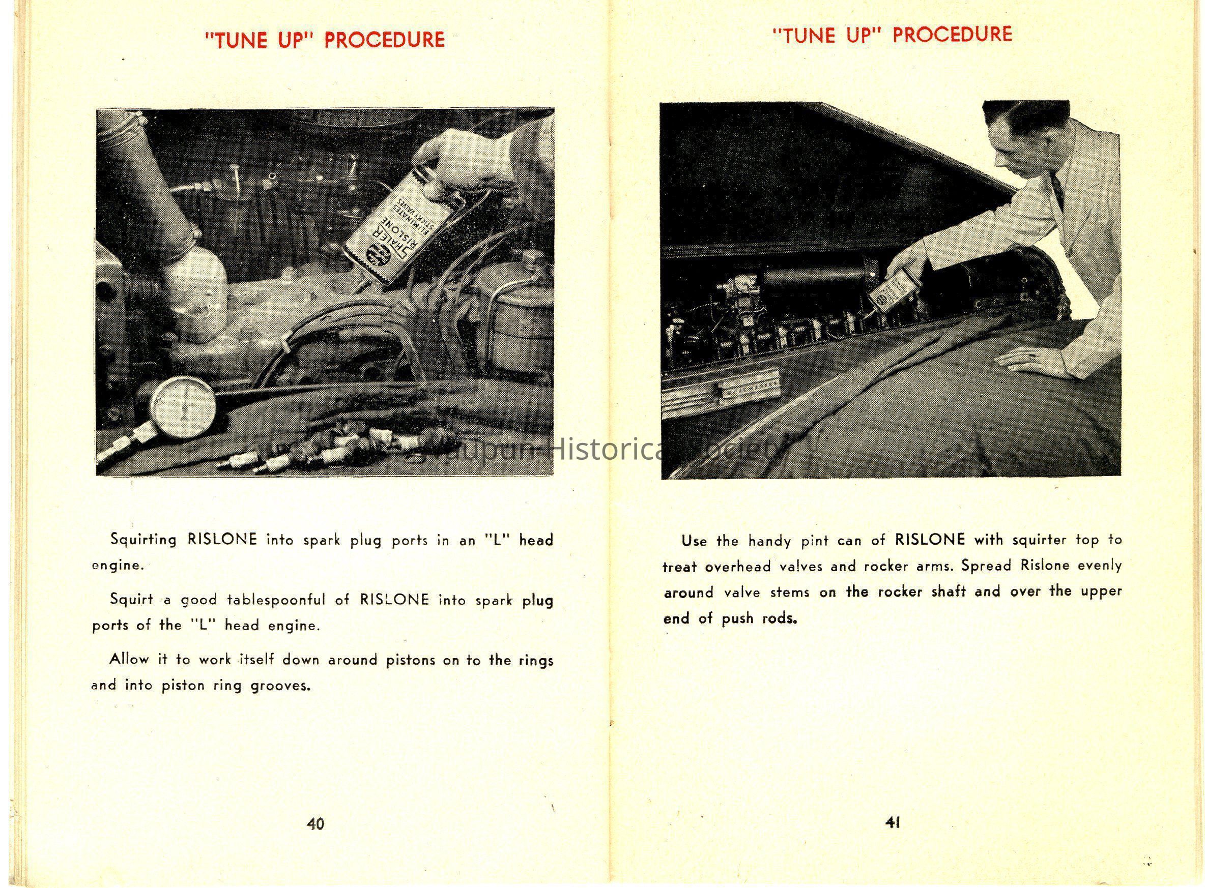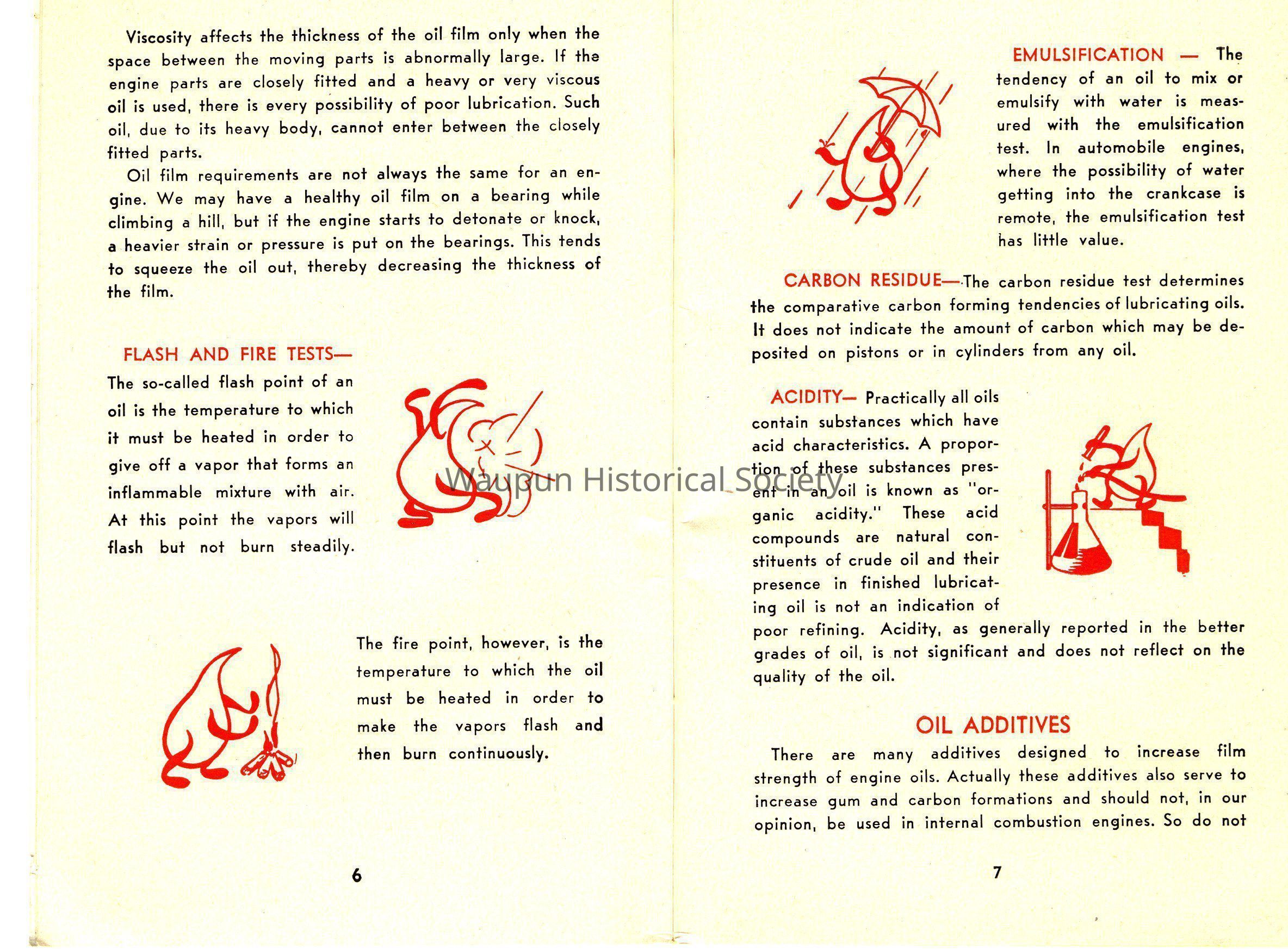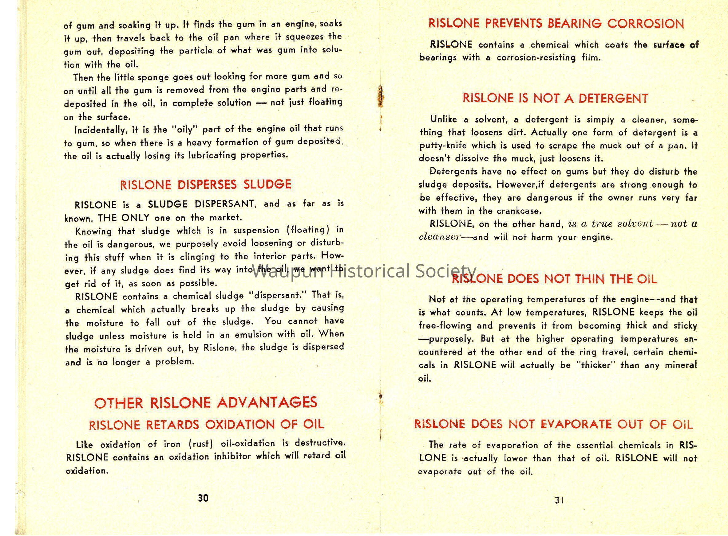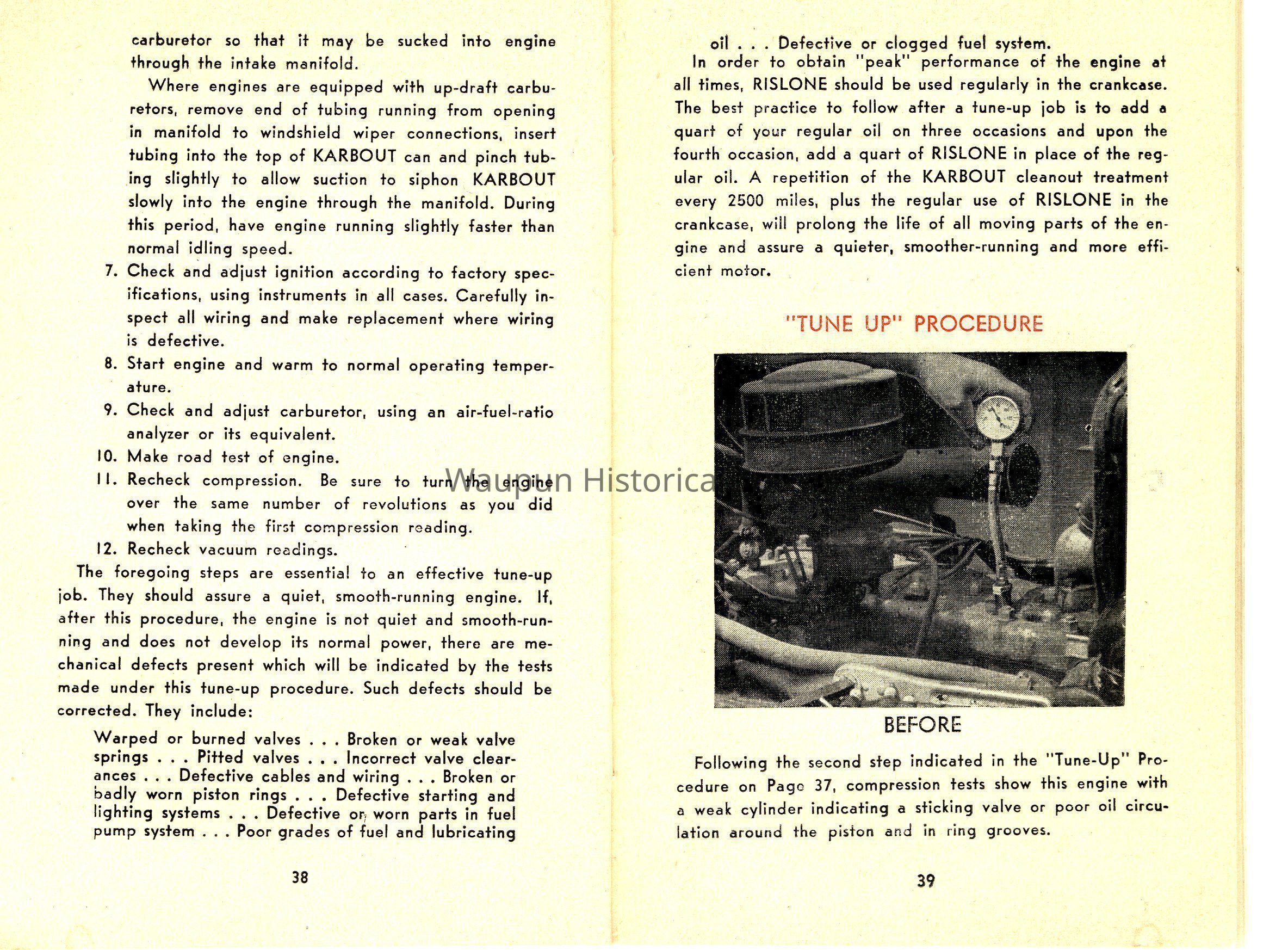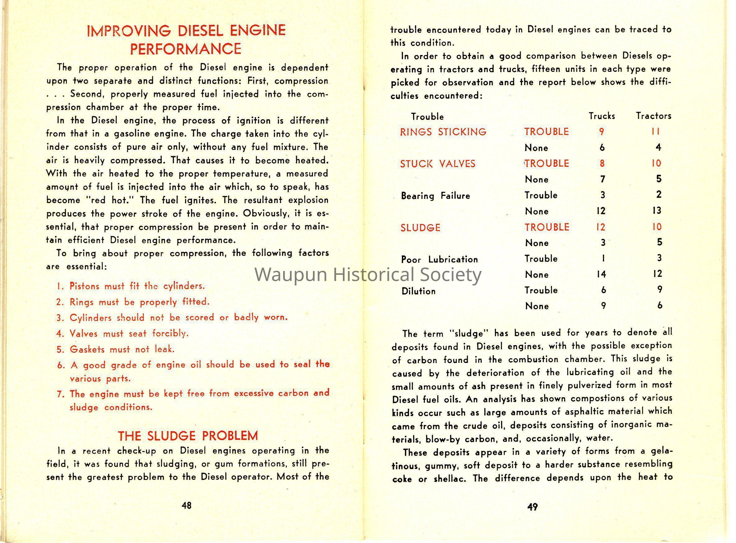 Informative booklet copyrighted by the Shaler Company of Waupun in 1940, entitled "Engine Performance" Included are the Karbout & Rislone Guarantees and several chapters on oil and various engines. There are two copies, one on display, the other stored with the photo collection.Acquisition