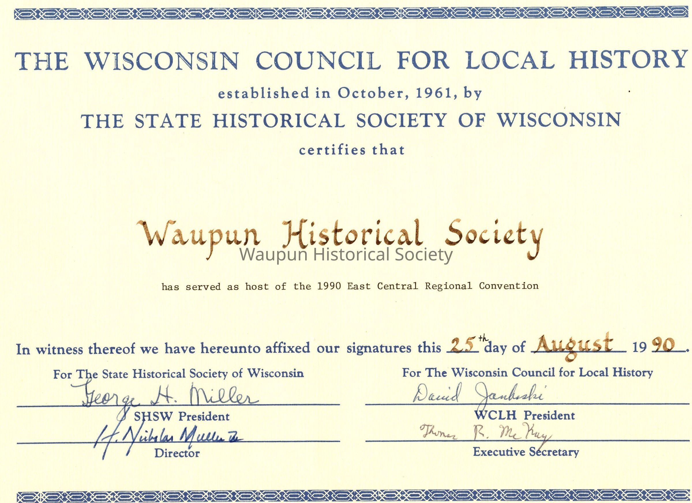The certificate was presented to the Waupun Historical Museum by the State Historical Society of Wisconsin, on August 25, 1990, for serving as host of the 1990 Central Regional Convention.