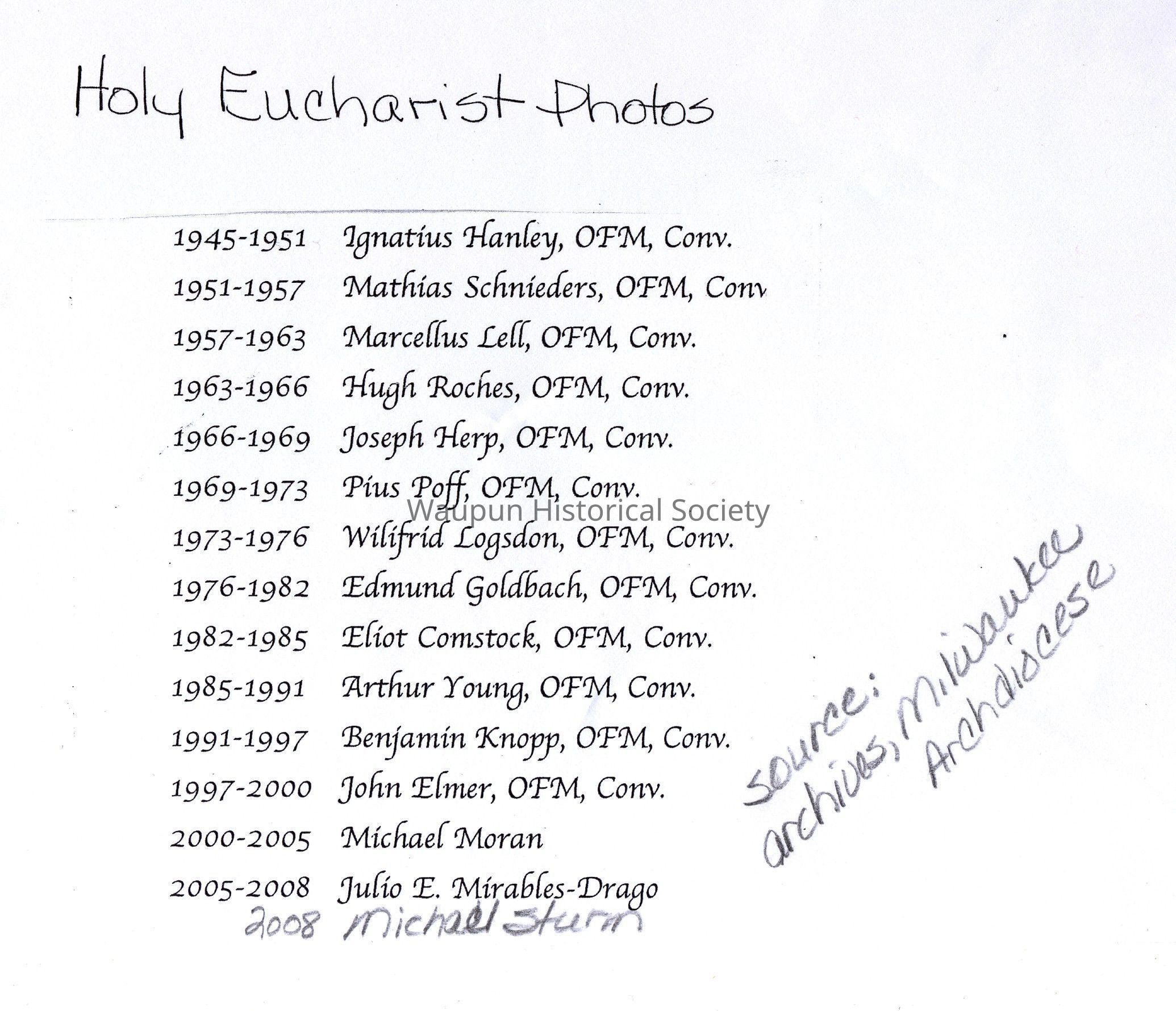 List, Church, St. Joseph Catholic, Priests. Photo of the list of ministers at the St. Joseph Catholic Church in Waupun, Wisconsin.