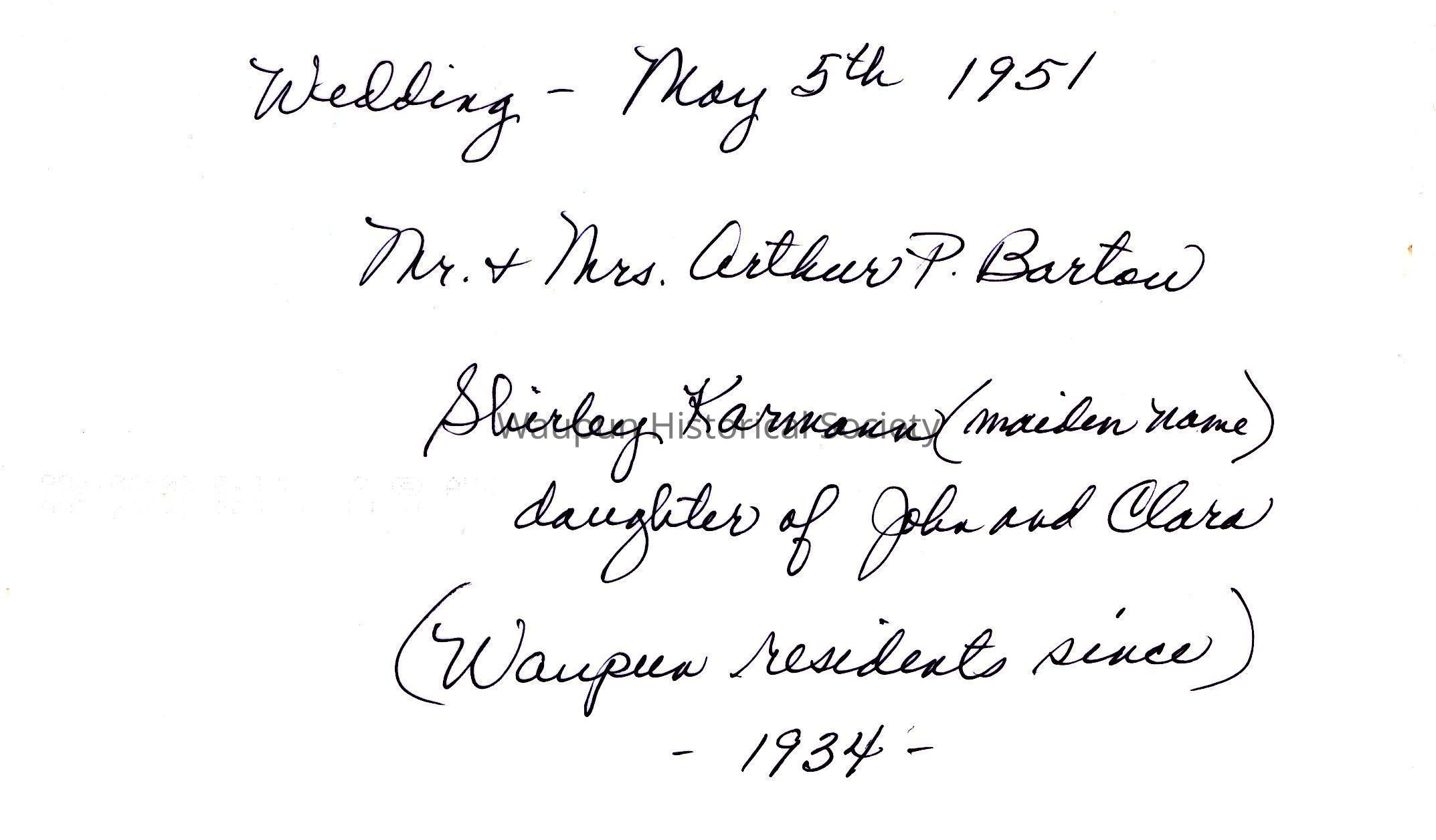Pictures of brides at The End of the Trail. It is grandparents and grand-daughter. The Grandparents wedding was May 5, 1951, Shirley Karmann, daughter of John and Clara, became Mr. & Mrs. Arthur P. Bartow. The grand daughter got married on April 29, 2006. Mary Johanna Bartow became Mr. & Mrs. Jason Pick, the weddings were 55 years apart.Acquisition