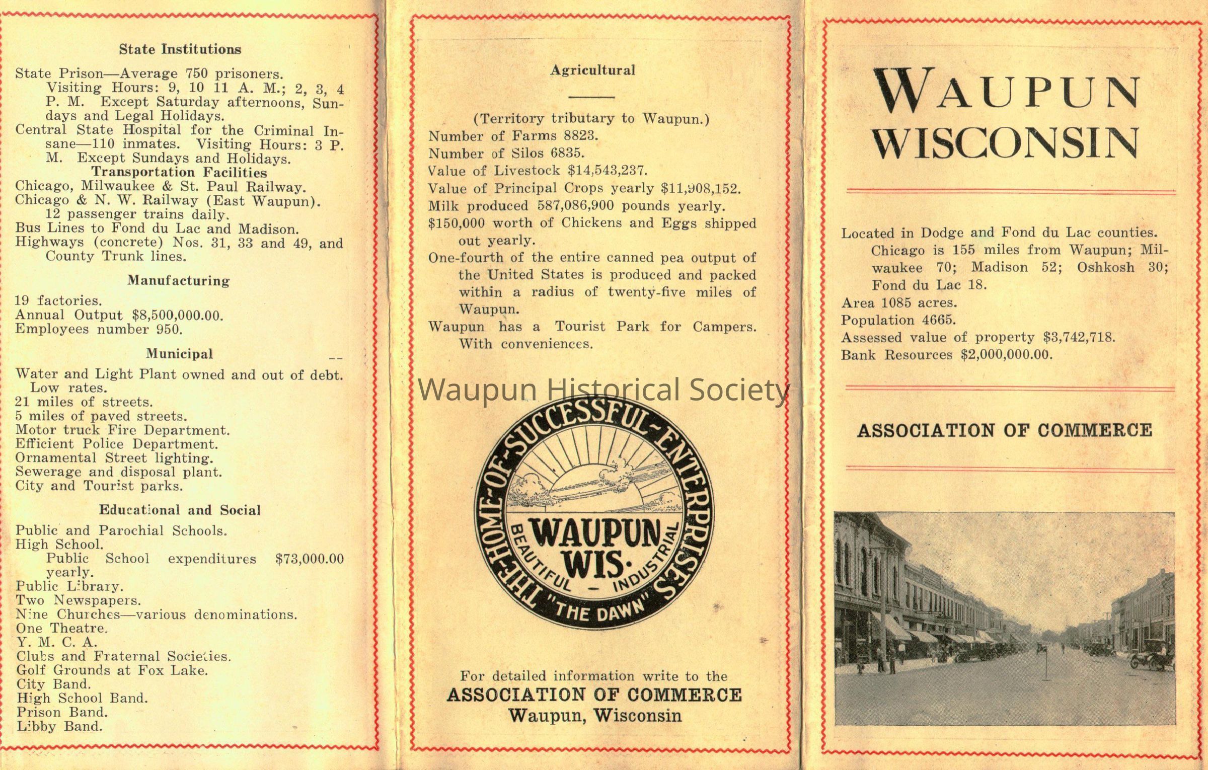 An advertising booklet prepared by the Waupun Chamber of Commerce. It lists a great deal of information about State Institutions, Transportation Facilities, Manufacturing, Municipal, Educational and Social, Agricultural, and Important Products. It also includes 23 pictures of Waupun. Date of publication is unkown but probably about the 1920s.Acquisition