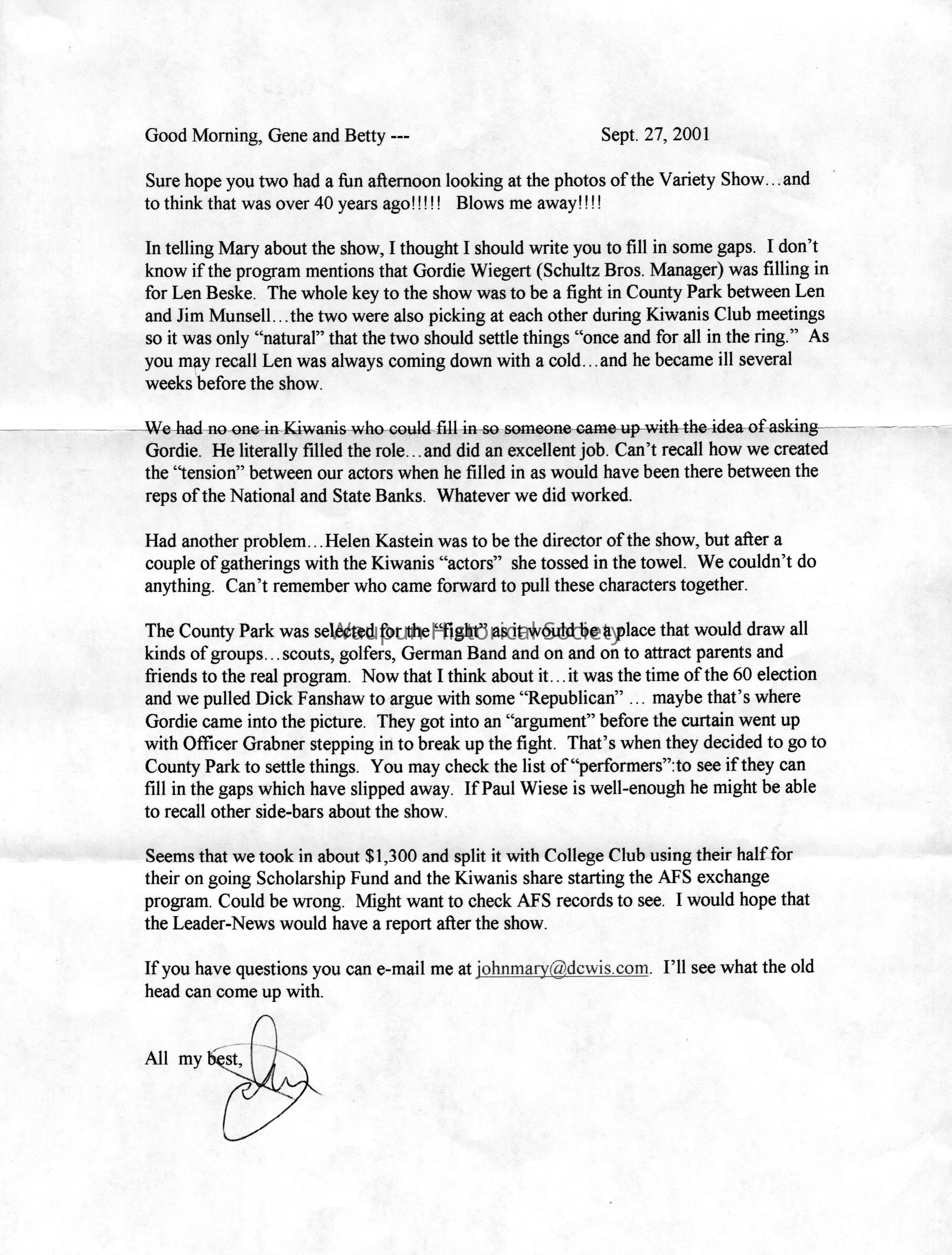 This letter was sent to Gene and Betty Buchholz on September 27, 2001. It was a follow up on the donation of a collection of pictures and programs from the March 31 and April 2, 1960 Variety Show presented by THE WAUPUN COLLEGE CLUB AND KIWANIS CLUB. It explains some of the details of the program.Acquisition