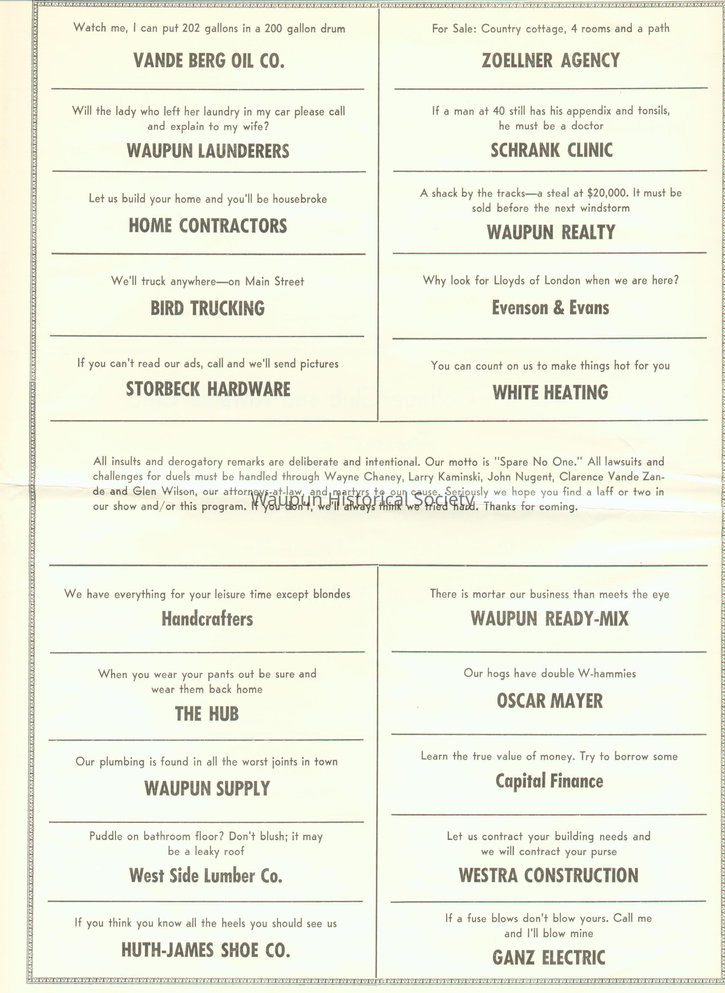 This is the second page of the program for the Variety Show presented by THE WAUPUN COLLEGE CLUB AND KIWANIS CLUB on March 31 and April 2, 1960. The program was presented on the stage in the school on north west corner of Fond du Lac and Franklin Streets. At this time, this was the Waupun High School.Acquisition