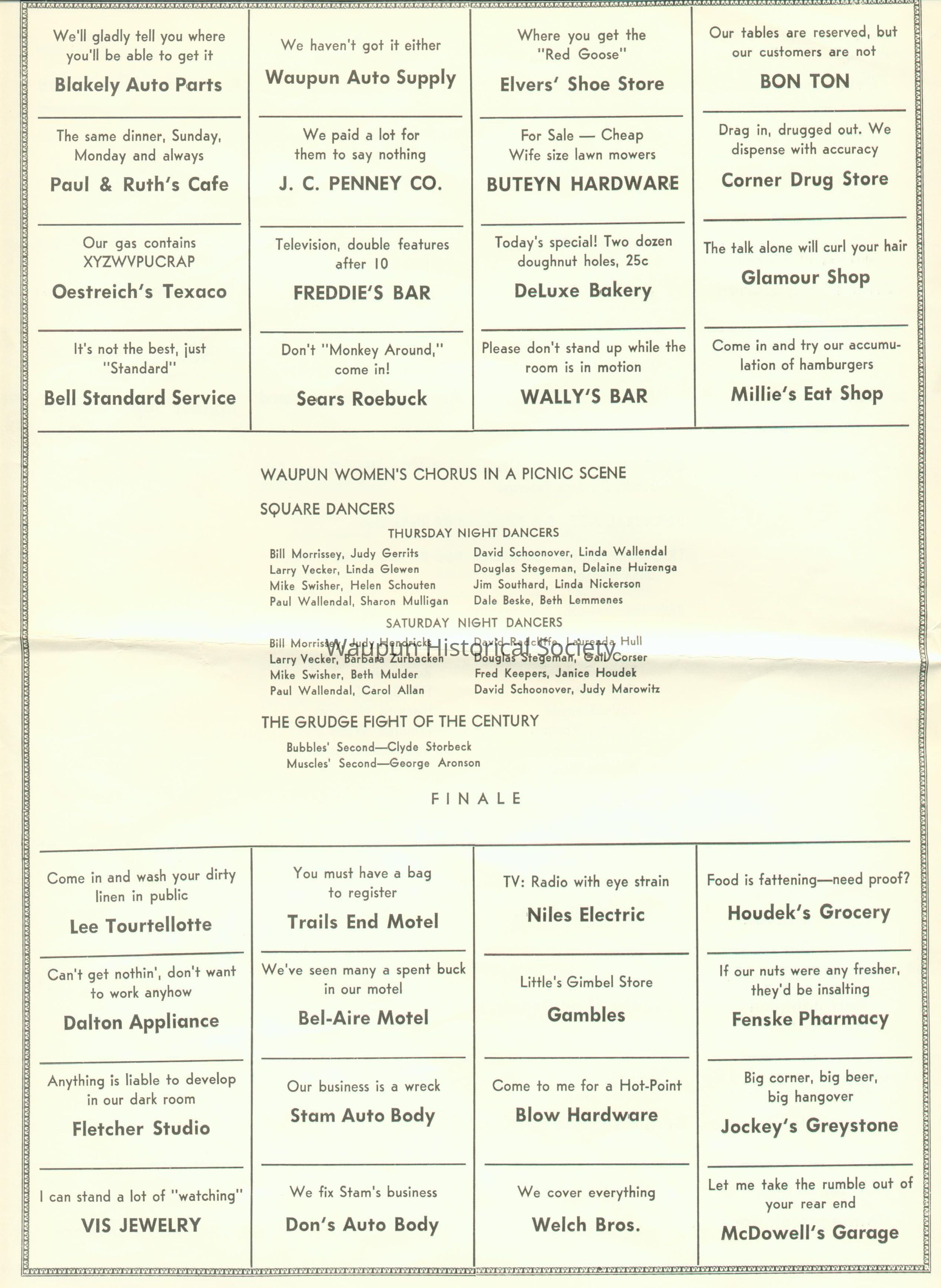This is the sixth page of the program for the Variety Show presented by THE WAUPUN COLLEGE CLUB AND KIWANIS CLUB on March 31 and April 2, 1960. The program was presented on the stage in the school on north west corner of Fond du Lac and Franklin Streets. At this time, this was the Waupun High School.Acquisition