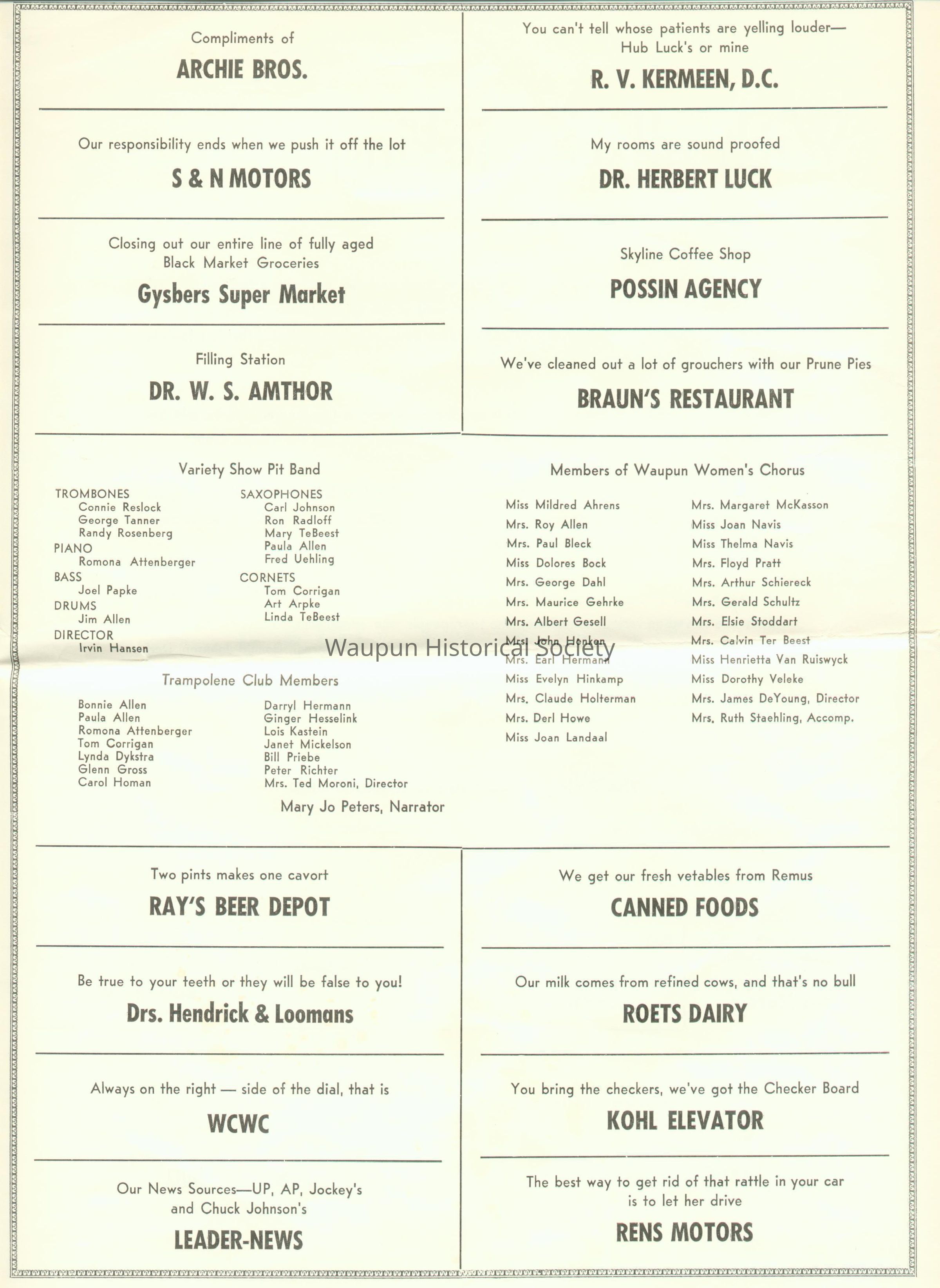This is the seventh page of the program for the Variety Show presented by THE WAUPUN COLLEGE CLUB AND KIWANIS CLUB on March 31 and April 2, 1960. The program was presented on the stage in the school on north west corner of Fond du Lac and Franklin Streets. At this time, this was the Waupun High School.Acquisition