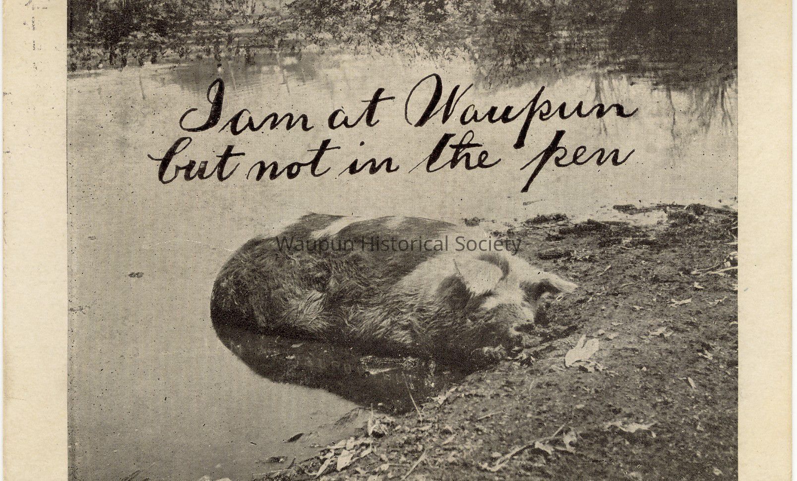 Postcard, Corrections, Wisconsin State Prison, I am in Waupun but not in the Pen. Postcard from Judy Cole. This postcard shows a pig and the caption is: "I am at Waupun, but not in the pen."