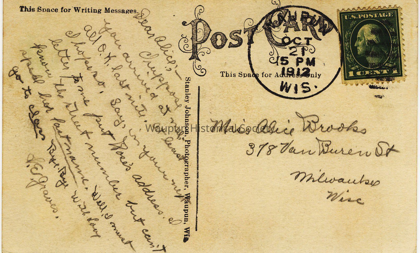 The postcard is addressed to Miss Alice Brooks, 378 VanBuren St., Milwaukee, WISC.