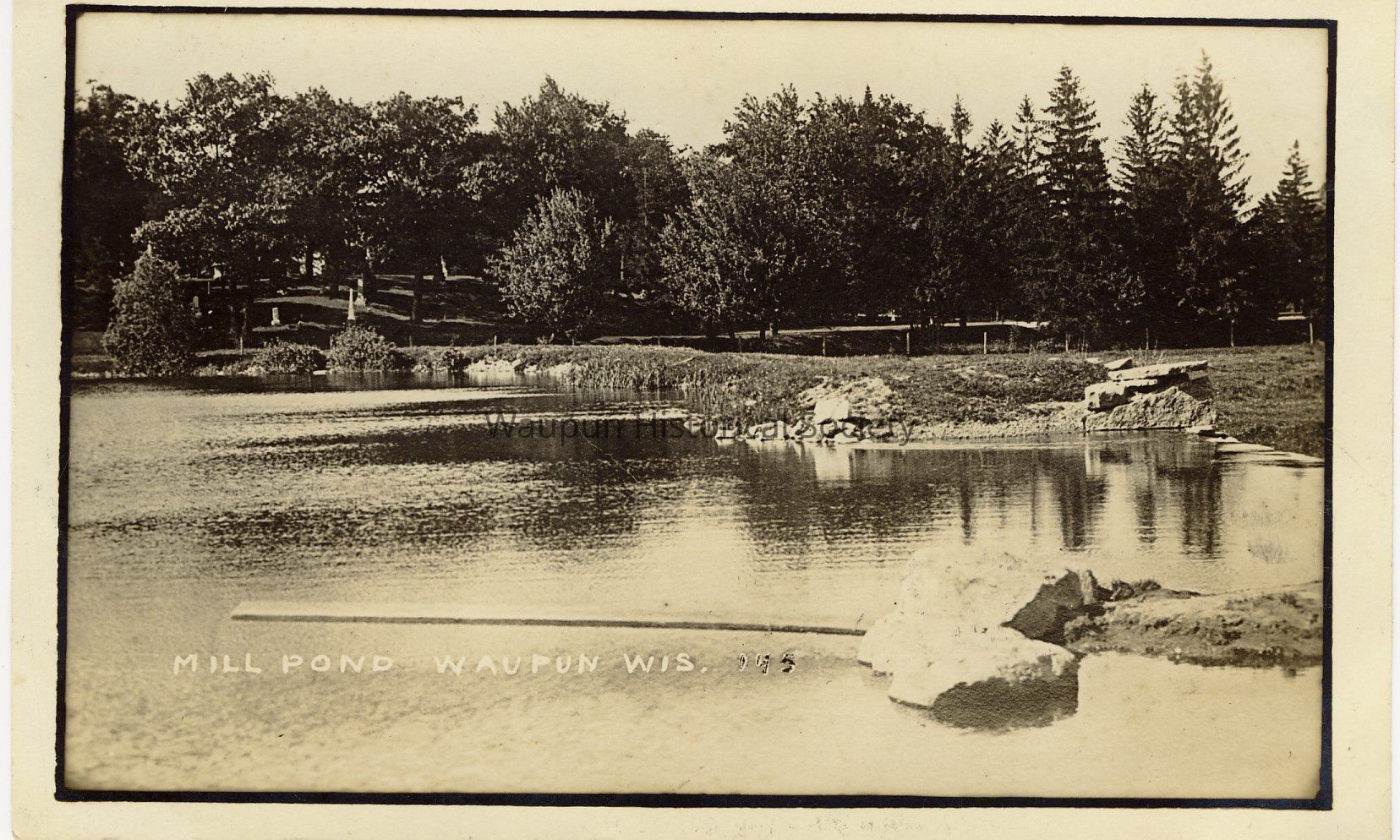 Postcard, Parks, Mill Pond. 1 postcard from Judy Cole. This postcard shows the Mill Pond. It has written on the front "Mill Pond Waupun WIS.