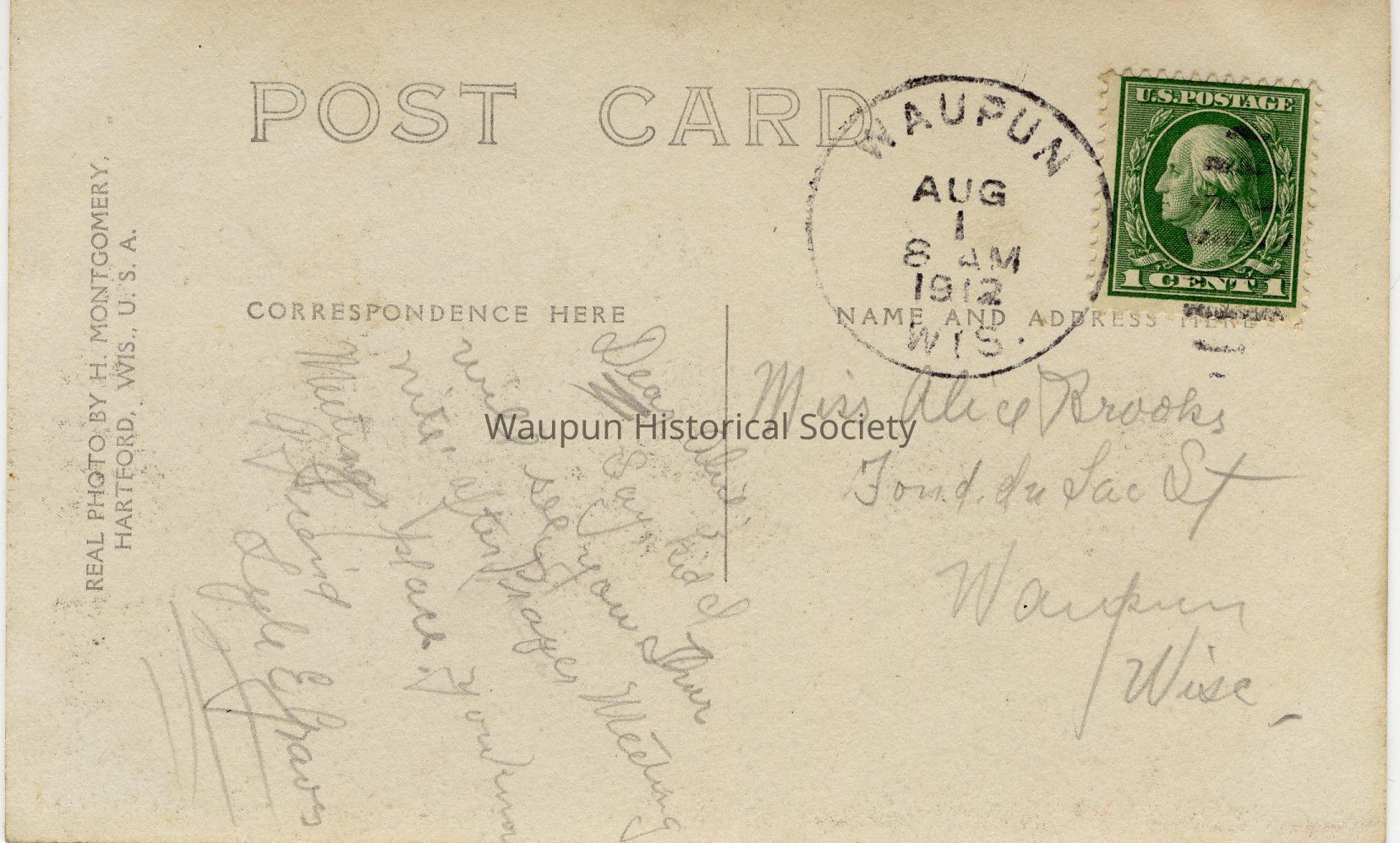 The postcard is Real Photo by H. Montgomery, Hartford, Wisc. U. S. A.