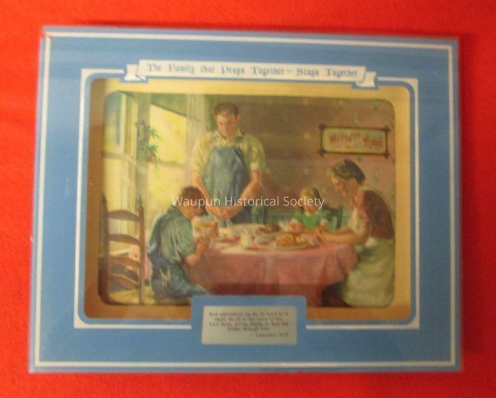 Print behind glass promotional titled " The Family That Prays Together - Stays Together. Color print with family at the table. The picture appears to be a cardboard tray that has been attached to the glass, giving it a blue a frame. The Bible verse from Colossians 3:17 is centered at the bottom. The overall size is 8"x 10."
