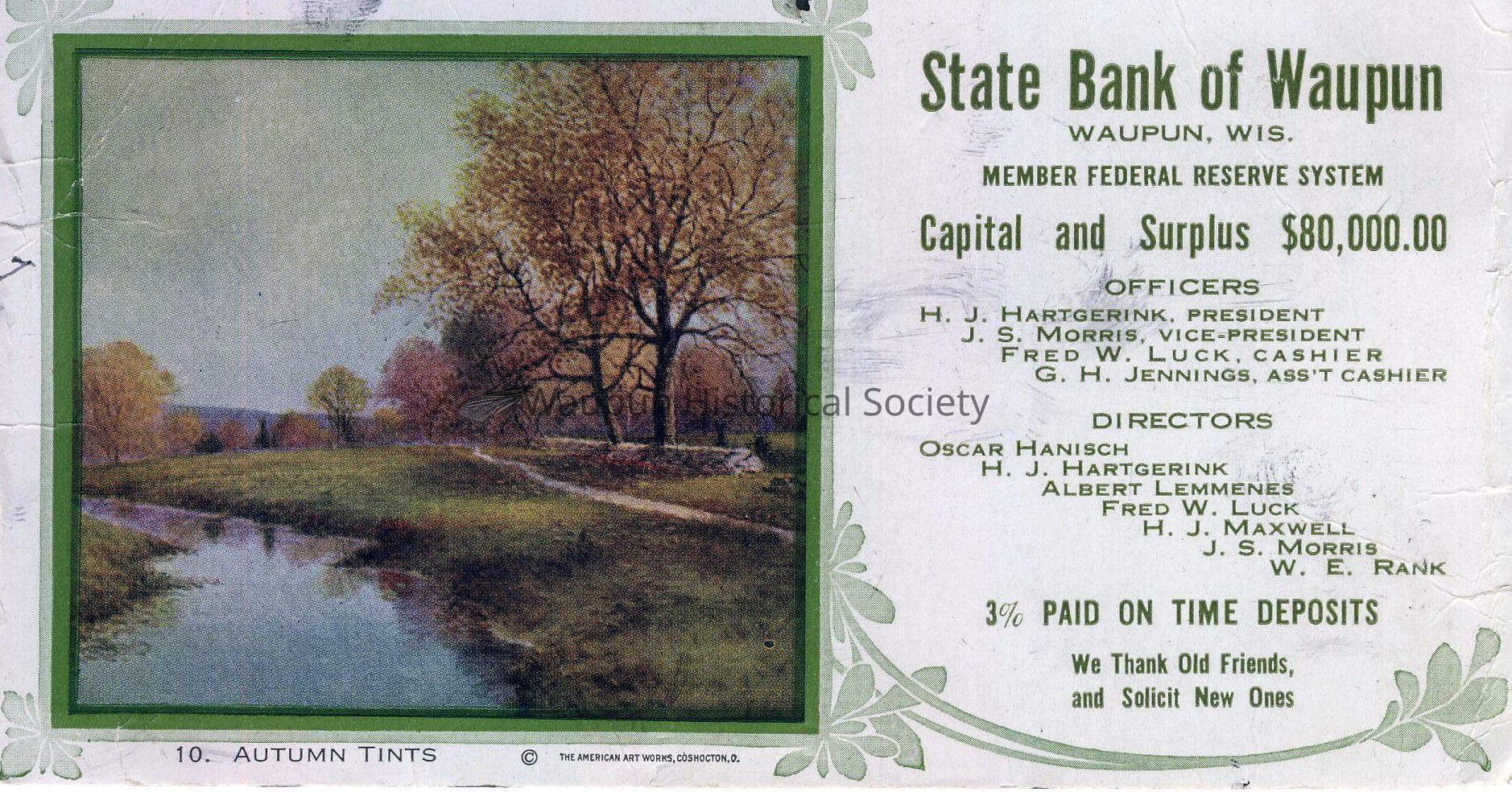 Advertising blotter. These color advertising blotters issued by the State Bank of Waupun, showing the bank officers and board of Directors.Acquisition
