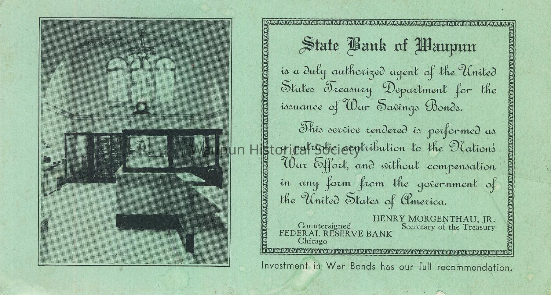 Advertising blotter. These color advertising blotters issued by the State Bank of Waupun, showing the bank officers and borad of Directors.Acquisition