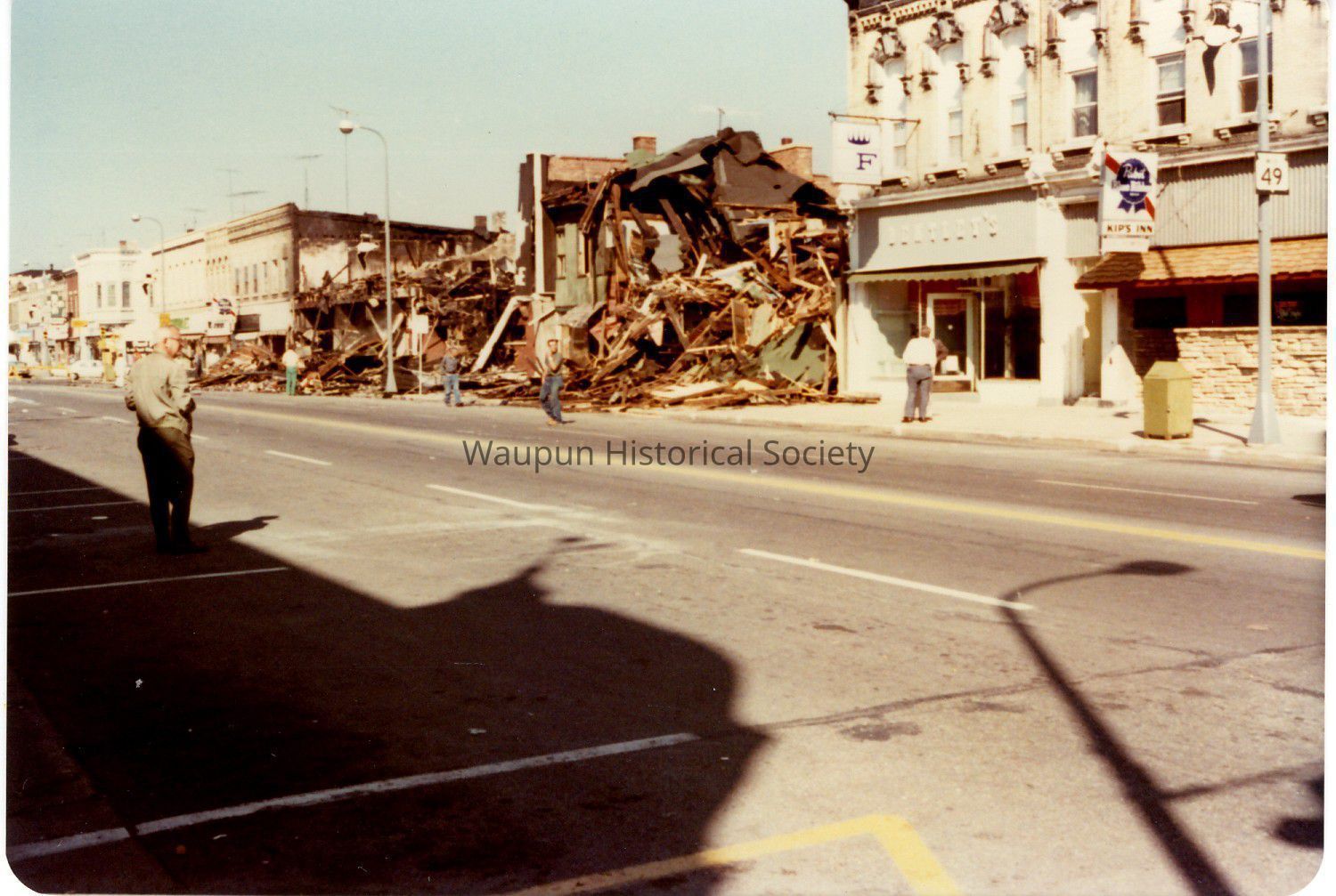 Photo looking north west on Main Street. The first pile of debris is where the hotel was. Actually the building was used primarily for arts and crafts. I believe that there was a barber shop in the structure. The next building are what burned. Shows the Bentley and Kip's Inn.Acquisition