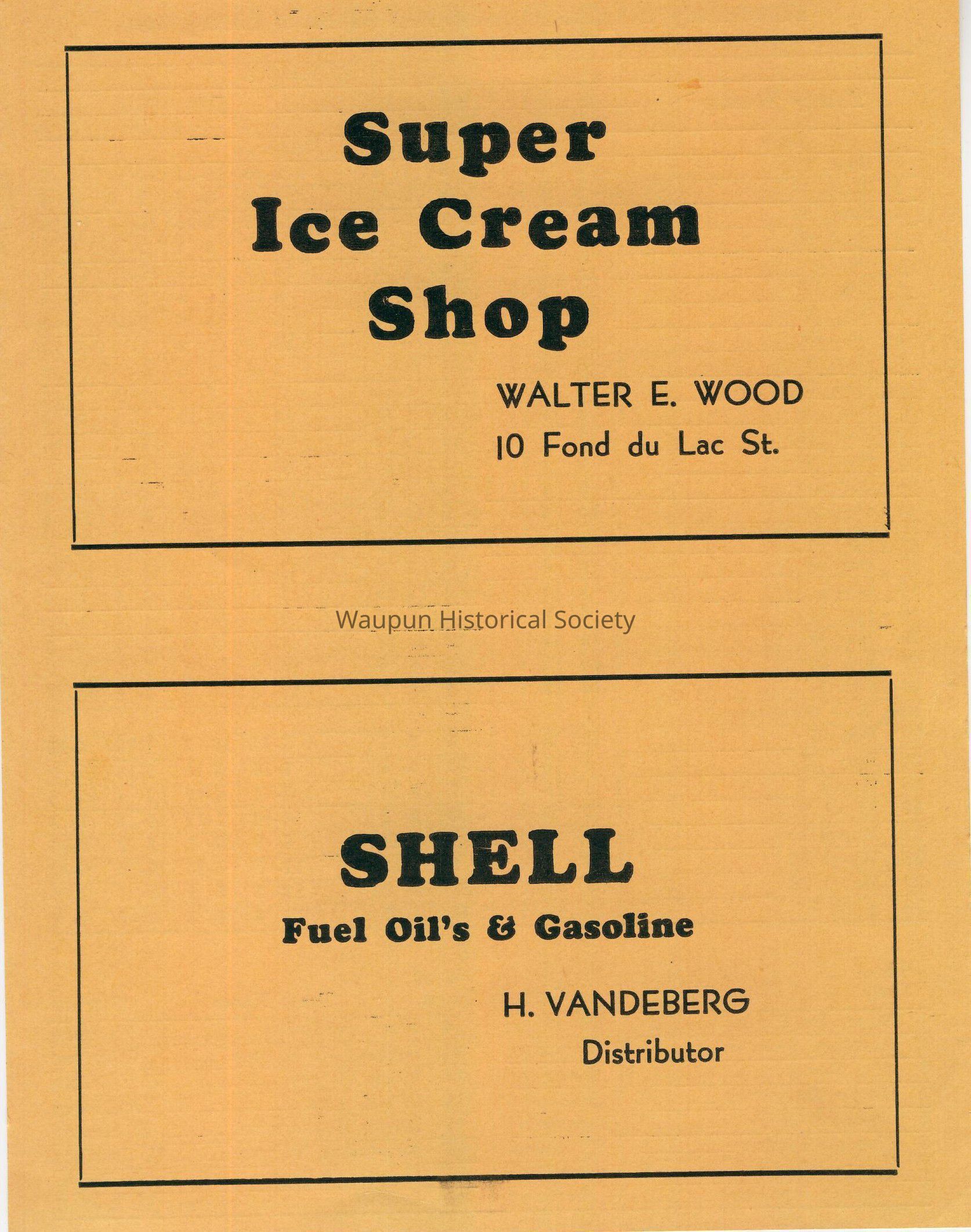 Super Ice Cream (located at 10 Fond du Lac St.), Waupun Auto Sales, Alto Co-op, Ohm's Shoe Shop, Marshall-Wells, Chuck's Tavern, Rumpus Bar, Possin's Insurance, Blow Hardware, Hollander's Tavern, Eagle Tavern, Mixed Aces, Street Department, Sportsman Tavern, The Men's Store, Radloff Concrete Products and Shell Fuel Oils and Gasoline, H. Vandeberg, Distributer.Acquisition
