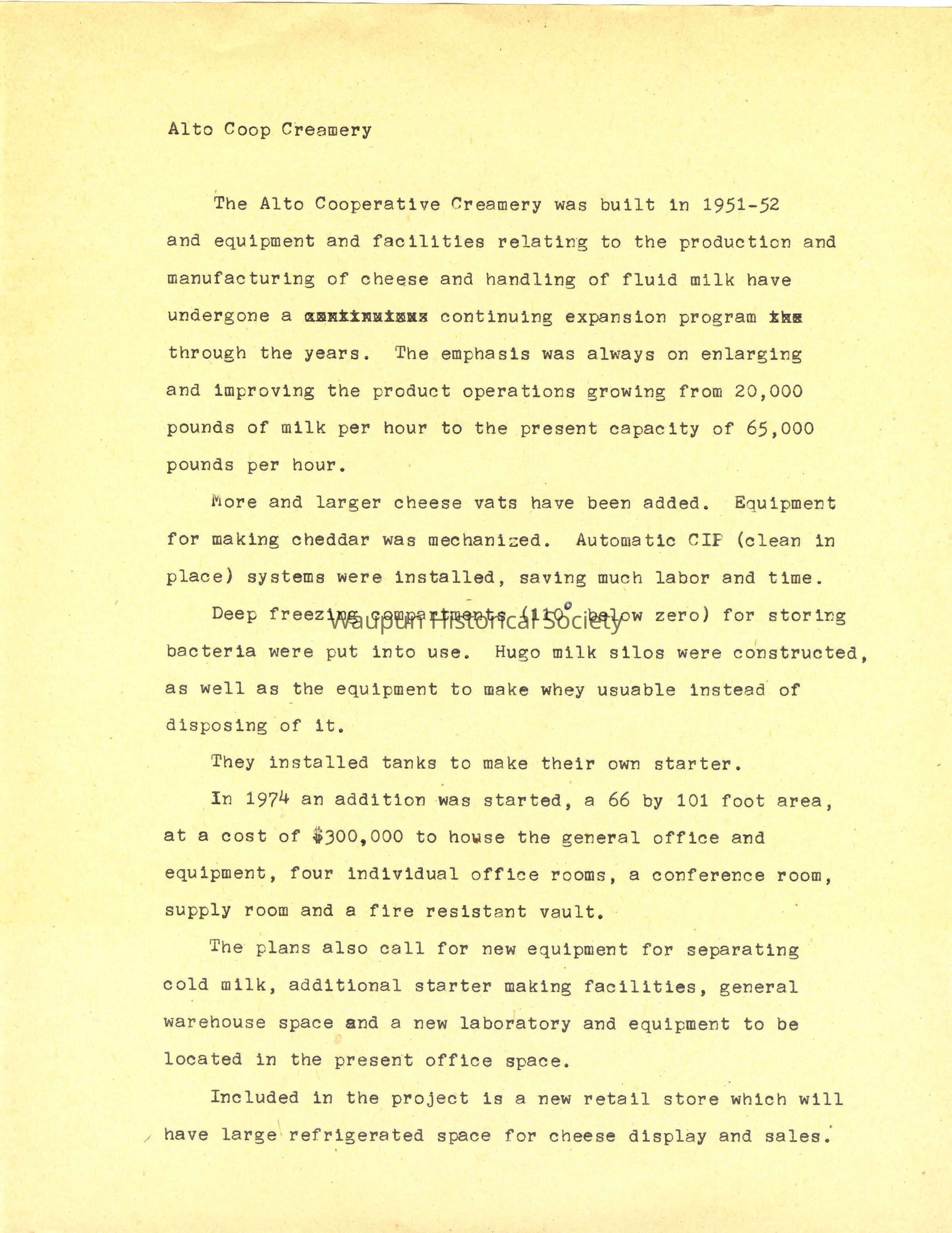 Historical information about Alto Co-op Creamery for the 1976 Bicentennial Celebration.