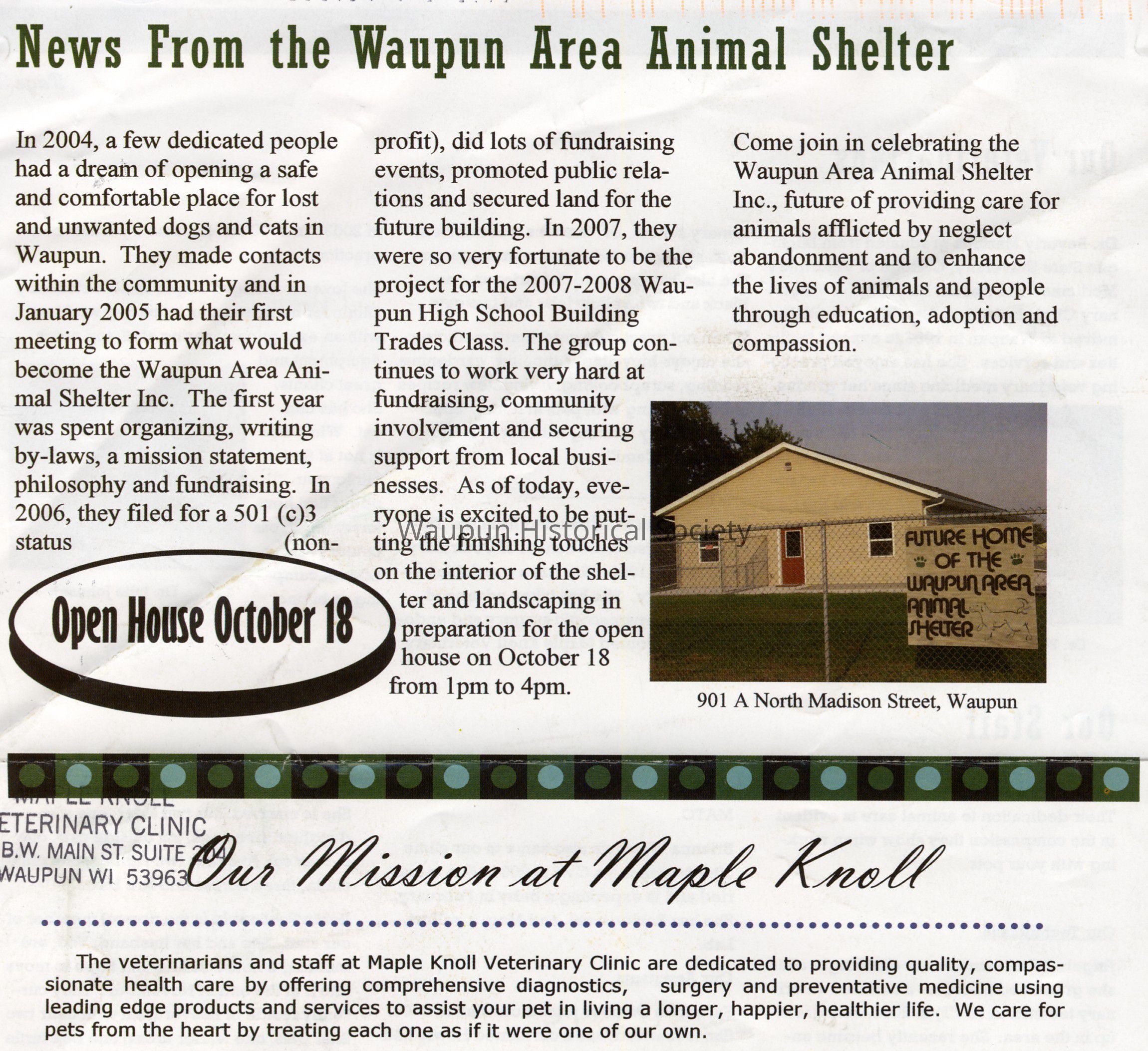 In 2004, a few dedicated people had a dream of opening a safe and comfortable place for lost and unwanted dogs and cats in Waupun. They made contacts within the community and in January 2005 had their first meeting to form what would become the Waupun Area Animal Shelter Inc. The first year was spent organizing, writing by-laws, a mission statement, philosophy and fundraising. In 2006, they filed for a 501 (c)3 status (non-profit), did lots of fundraising events, promoted public relations and secured land for the future building. In 2007, they were so very fortunate to be the project for the 2007-2008 Waupun High School Building Trades Class. The group continues to work very hard at fundraising, community involvement and securing support from local businesses. As of today, everyone is excited to be putting the finishing touches on the interior of the shelter and landscaping in preparation for the open house on October 18 from 1pm to 4pm.