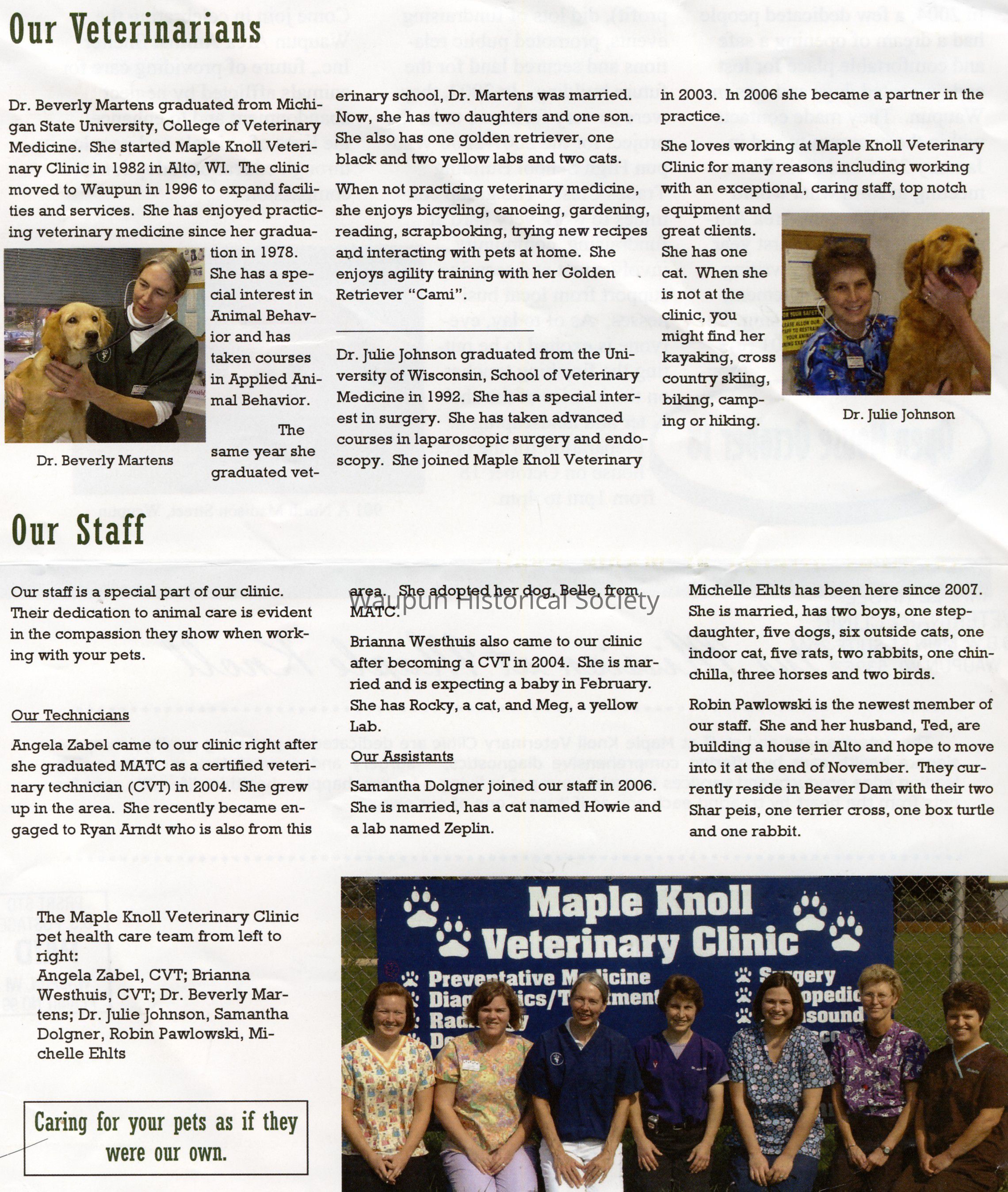 Caption Next to Photo:[The Maple Knoll Veterinary Clinic pet health care team from left to right: Angela Zabel, CVT; Brianna Westhuis, CVT; Dr. Beverly Martens; Dr. Julie Johnson, Samantha Dolgner, Robin Pawlowski, Michelle Ehlts.]Acquisition