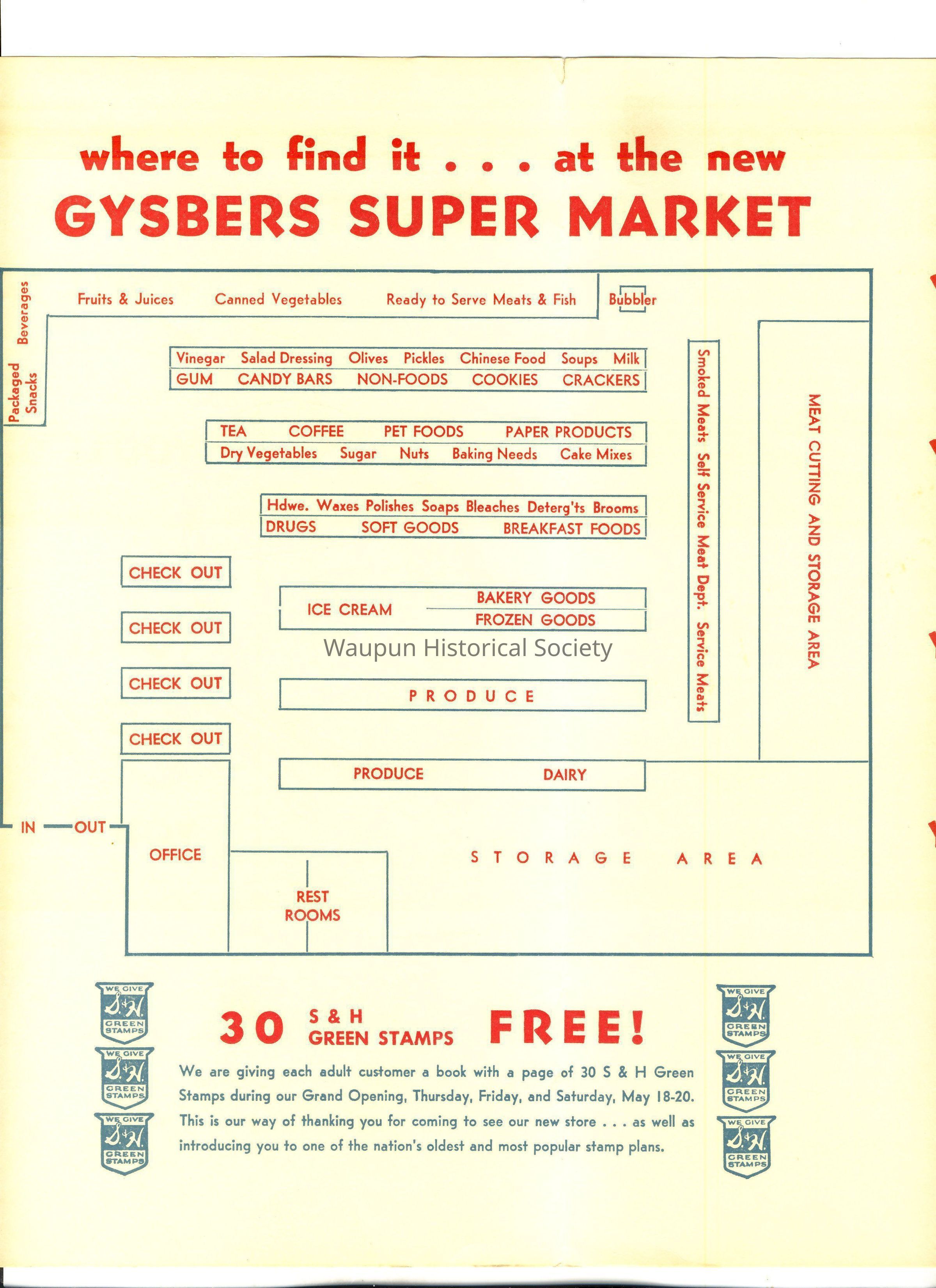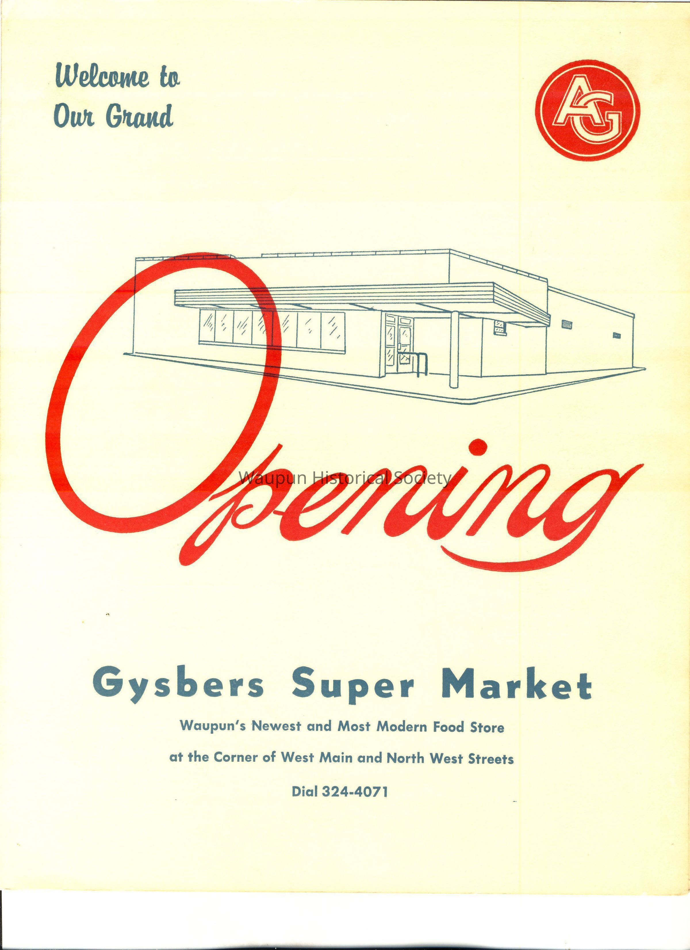 8 1/2" x 11" announcement - Welcome to Our Grand OPENING - Gysbers Super Market. Waupun's Newest and Most Modern Food Store at the Corner of West Main and North West Streets