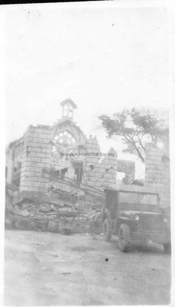 Photograph, Wrecked Church with Jeep in Front, WWIIEntry/Object ID