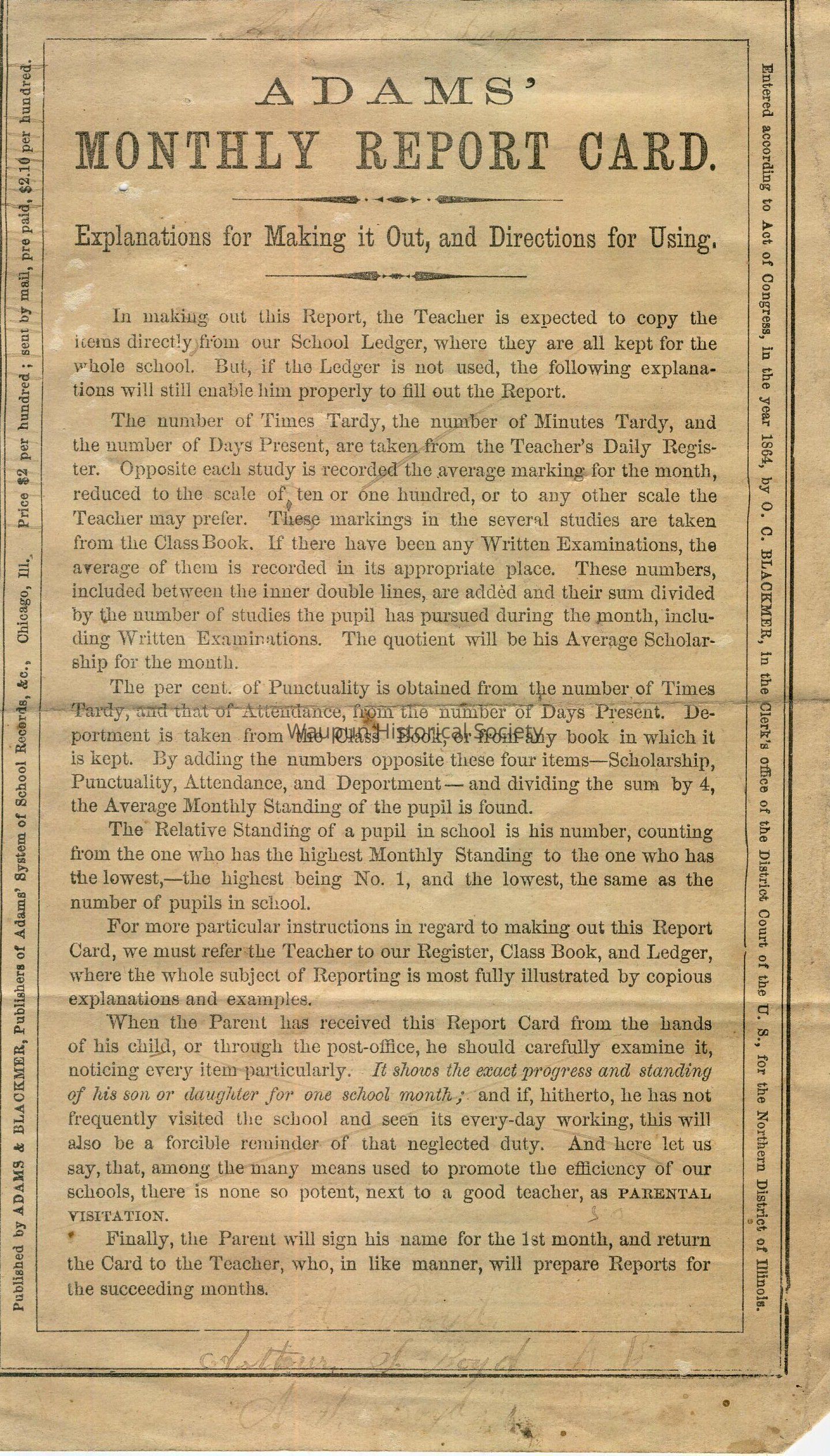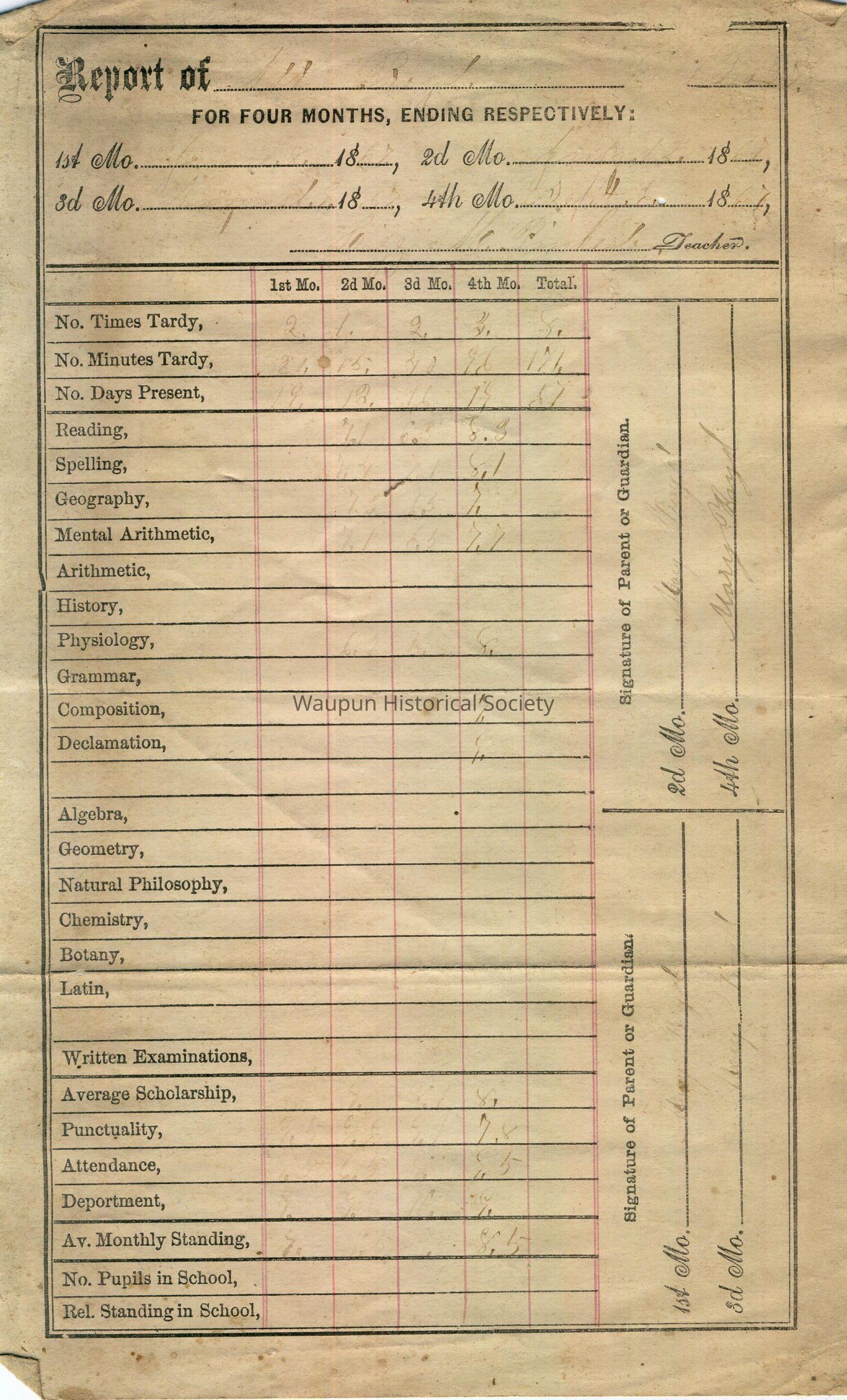 Arthur S. Boyd report card 1867, for the months of June, July, August and September. Signed four times (each month) by his mother, Mary Boyd. The teacher was Lizzie M. Pinkerton. Arthur was tardy a total of 8 times in 4 months, 176 minutes tardy total, and present 61 days. His standing in Reading was 8.3; Spelling, 8.1; Geography, 7.0; Mental Arithmetic, 7.7; Physiology, 8; Composition, 7; Declamation, 9. Average scholarship, 8; Punctuality, 7.8; Attendance, 9.5; Deportment, 9; Average Monthly Standing, 8.5.
