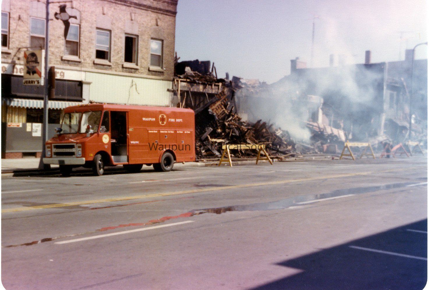 Photo looking north east. Notice the Waupun Fire Department truck in the picture. The building to the right is the old hotel. Notice Jerry's Bar. These buildings were all threatened.Acquisition