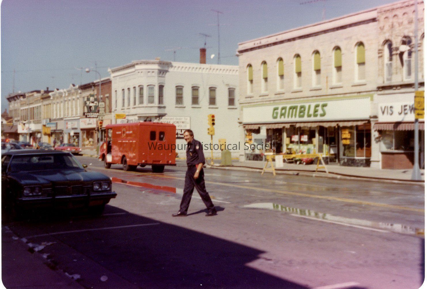 Unknown fireman. Notice the Waupun Fire Truck leaving the scene. Notice also the Gambles Store and Vis Jewelers. You can also see the sign for the Bon Ton in the next block.Acquisition