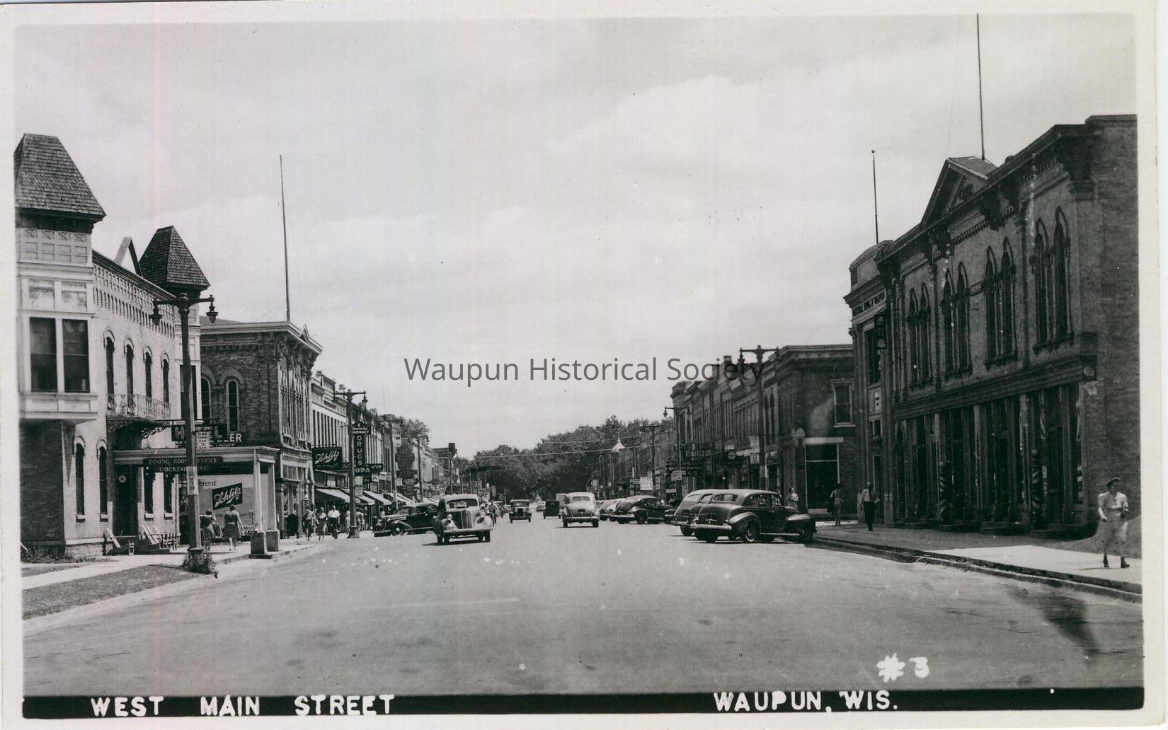 Postcard, Main Street Waupun, Looking East, circa 1940. Two postcards are attached. They are the same, but the first is shifted to the right, the second , shifted to the leftAcquisition
