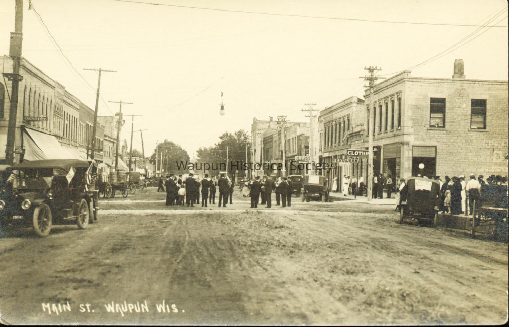 Postcard, Main Street Waupun, Looking East. Band is playing in the street.Acquisition
