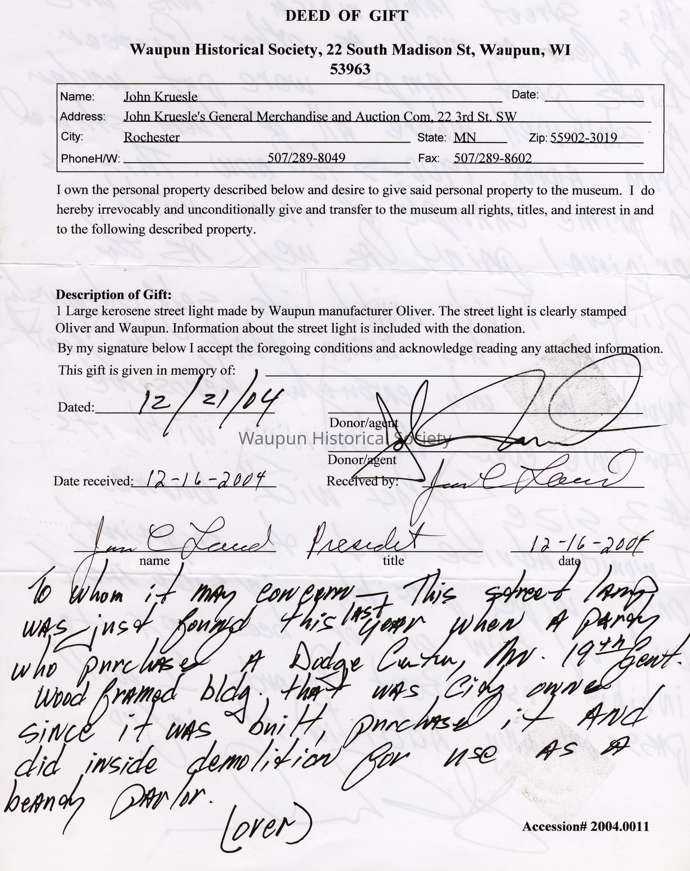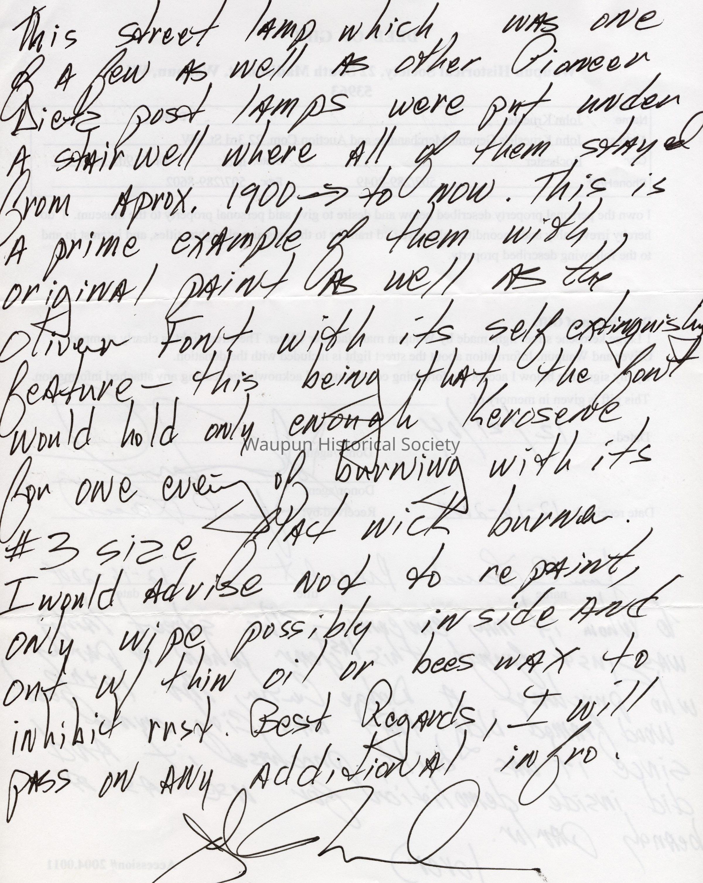 Photograph, Oliver Lamp. Tale of the Lamp from John Kruesle Rochester MN dated 2004