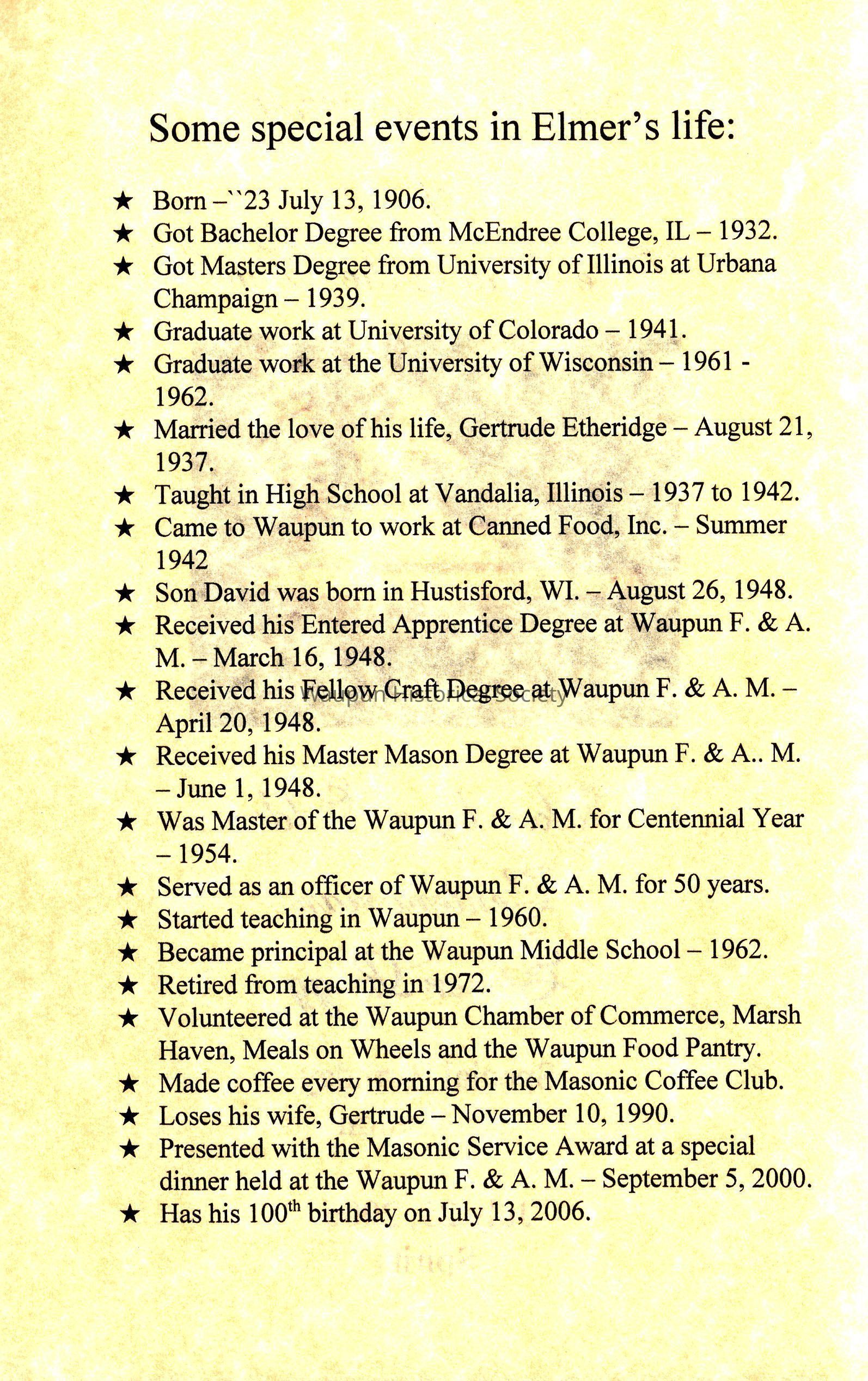 * Received his Master Mason Degree at Waupun F. & A.. M. - June 1, 1948.