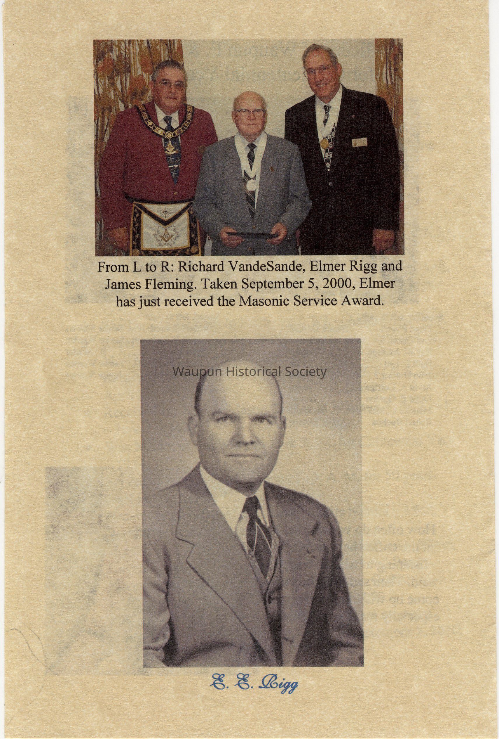From L to R: Richard VandeSande, Elmer Rigg and James Fleming. Taken September 5, 2000, Elmer has just received the Masonic Service Award.