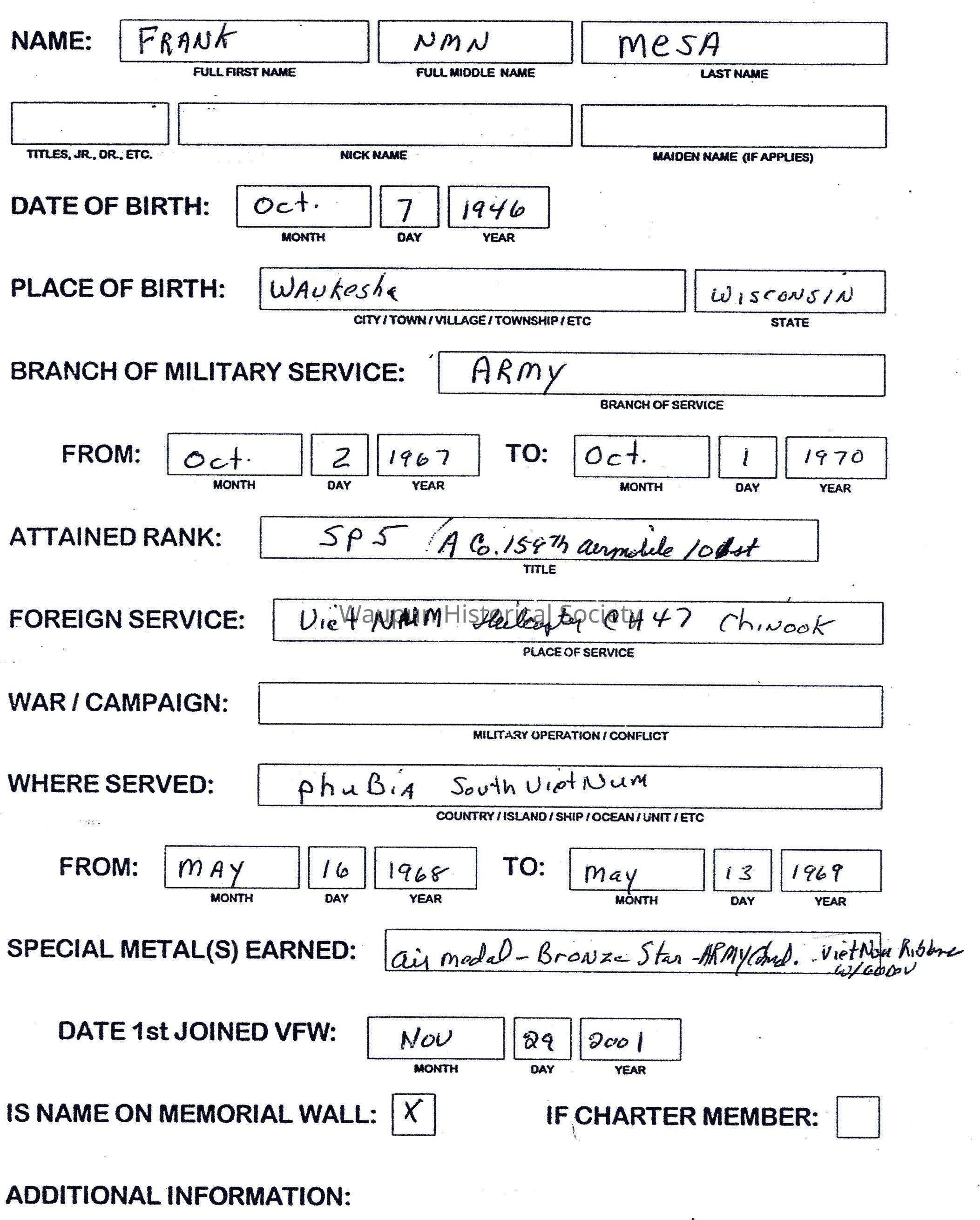 Frank joined the VFW on November 29, 2001 and is on the Memorial Wall.Acquisition