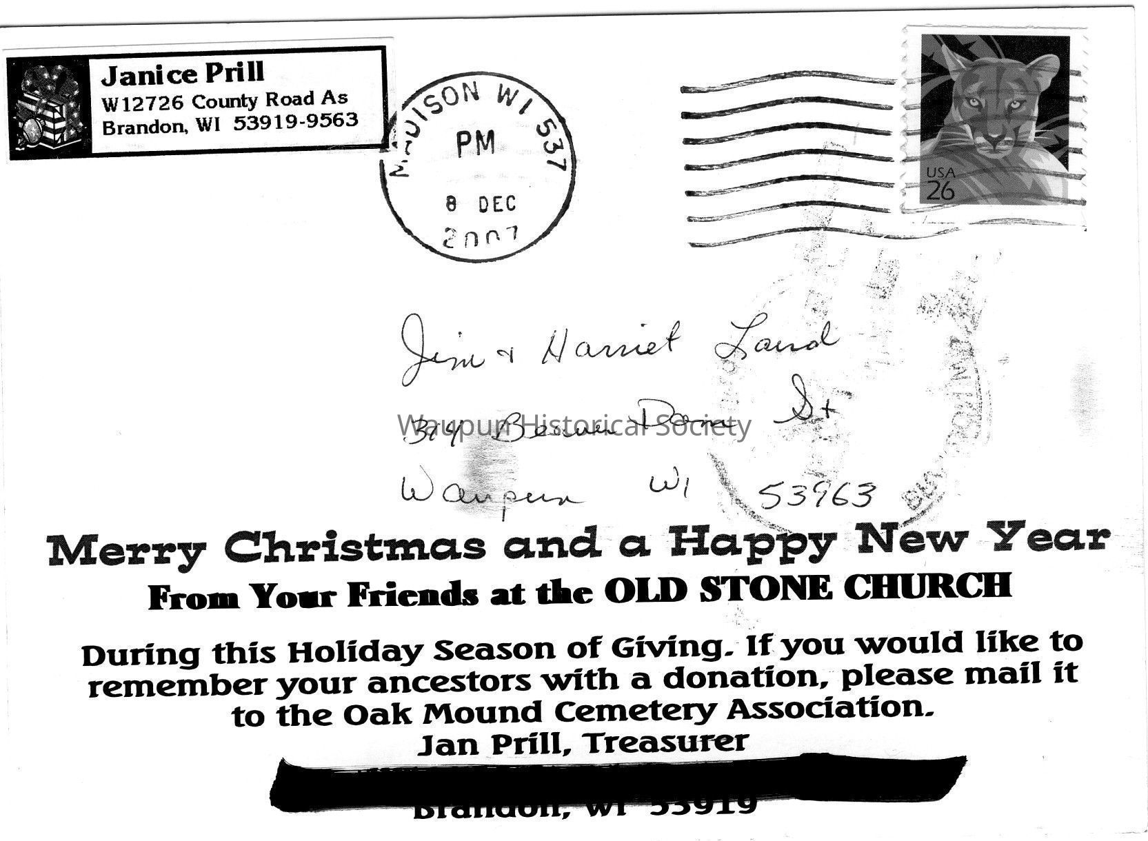 Sent by Janice Prill treasurer of the Old Stone Church in Brandon as a reminder to remember ancestors donations for the season.Acquisition