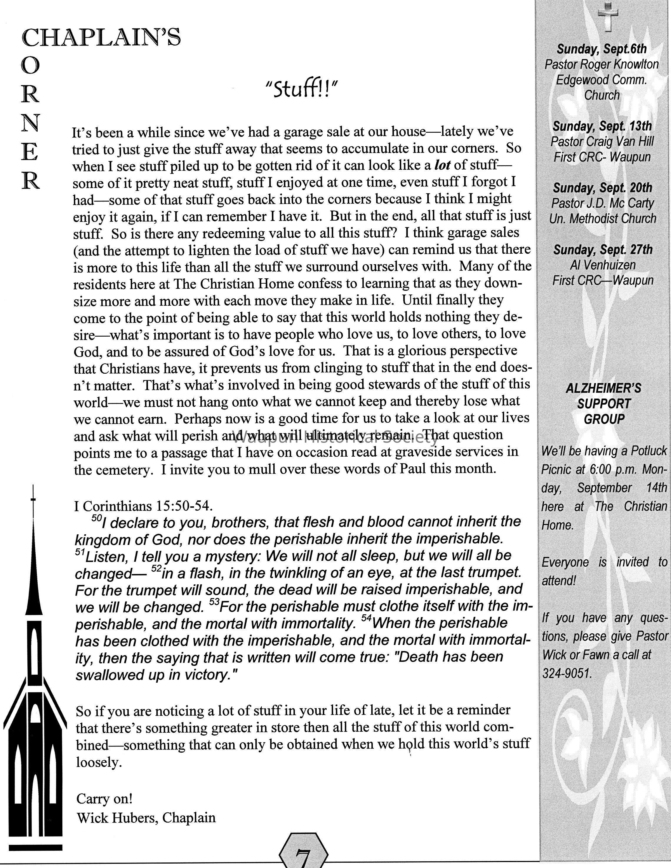 It's been a while since we've had a garage sale at our house—lately we've tried to just give the stuff away that seems to accumulate in our corners. So when I see stuff piled up to be gotten rid of it can look like a lot of stuff—some of it pretty neat stuff, stuff I enjoyed at one time, even stuff I forgot I had—some of that stuff goes back into the corners because I think I might enjoy it again, if I can remember I have it. But in the end, all that stuff is just stuff. So is there any redeeming value to all this stuff? I think garage sales (and the attempt to lighten the load of stuff we have) can remind us that there is more to this life than all the stuff we surround ourselves with. Many of the residents here at The Christian Home confess to learning that as they down-size more and more with each move they make in life. Until finally they come to the point of being able to say that this world holds nothing they desire—what's important is to have people who love us, to love others, to love God, and to be assured of God's love for us. That is a glorious perspective that Christians have, it prevents us from clinging to stuff that in the end doesn't matter. That's what's involved in being good stewards of the stuff of this world—we must not hang onto what we cannot keep and thereby lose what we cannot earn. Perhaps now is a good time for us to take a look at our lives and ask what will perish and what will ultimately remain. That question points me to a passage that I have on occasion read at graveside services in the cemetery. I invite you to mull over these words of Paul this month