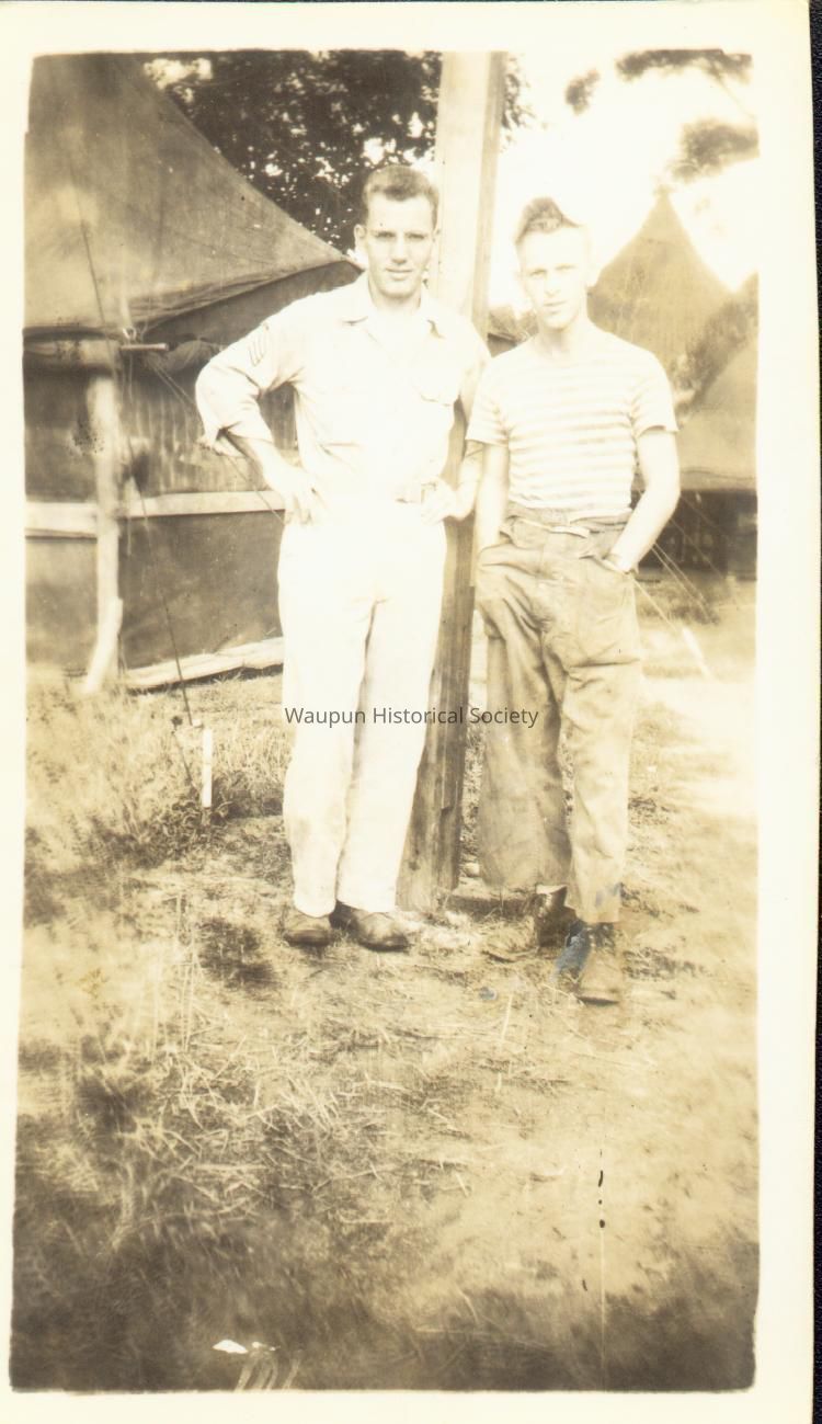 Photo of two men standing outside tent during WWII.Entry/Object ID