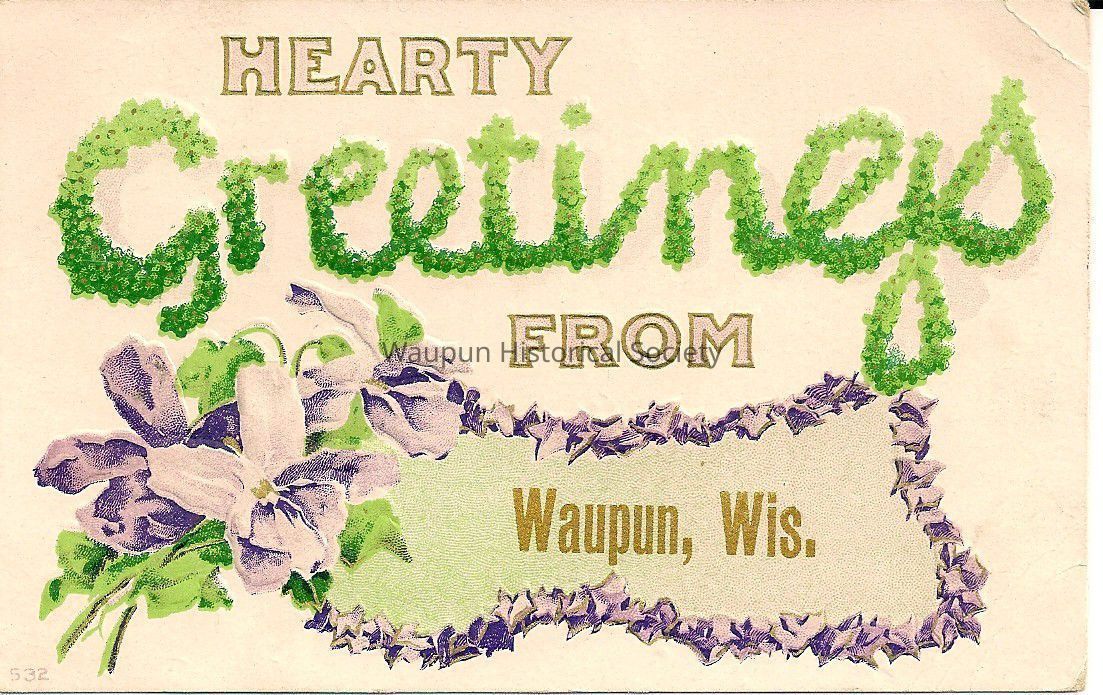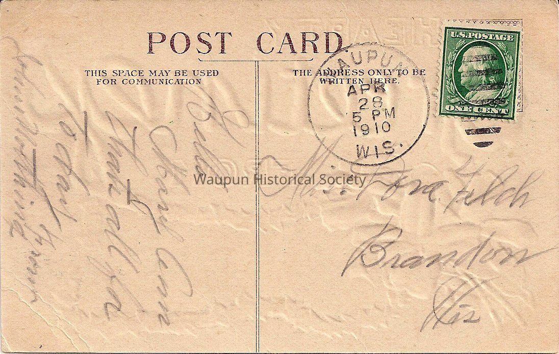 Postcard showing Hearty Greetings from Waupun, Wis. On the back is the date April 28, 1910 from Waupun. It was addressed to Miss Dora Felch in Brandon, Wis. It indicates: "Hello, Mary Ann, thats all for today. From John Nothing."Acquisition
