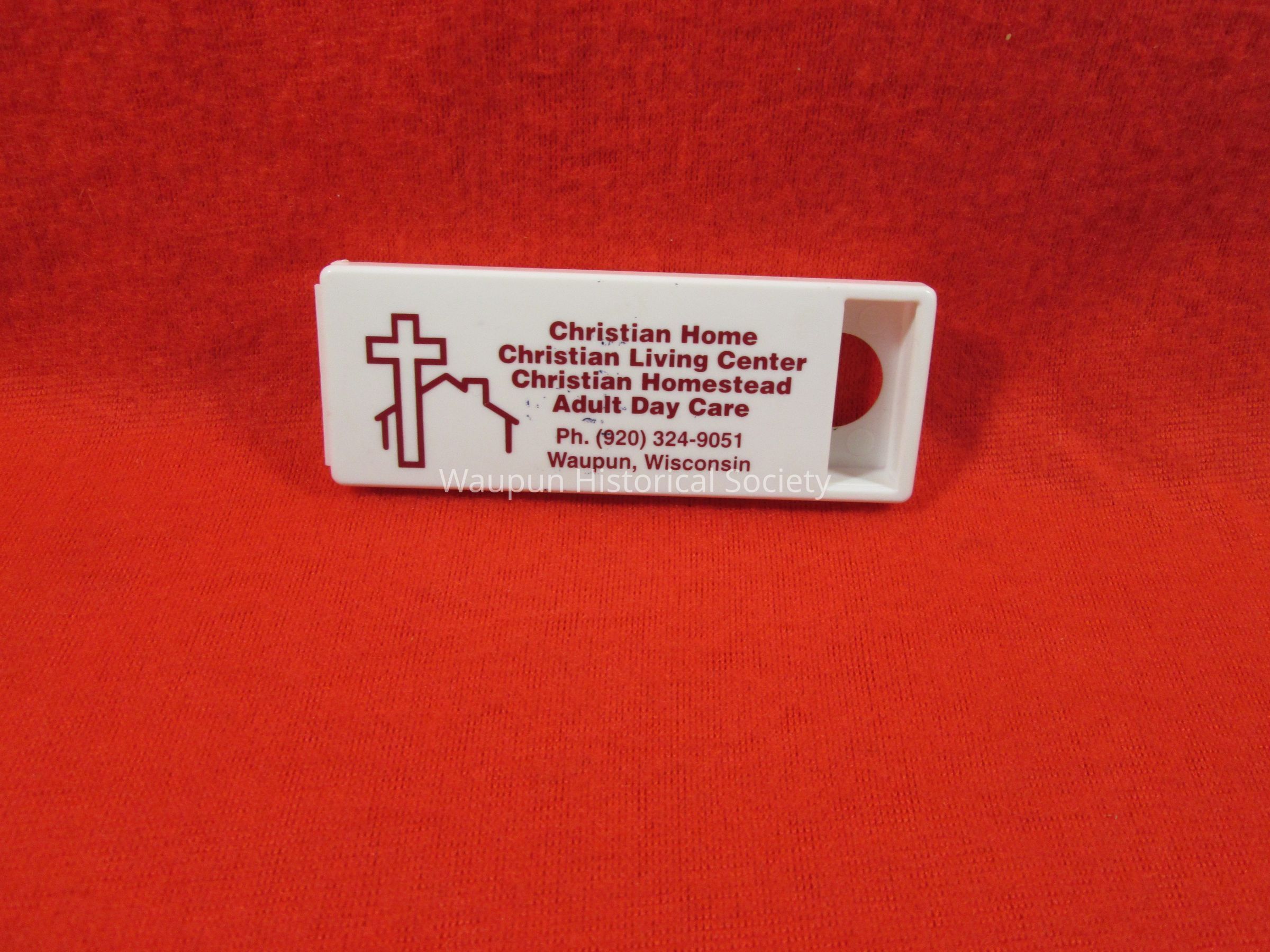 A Bandage Container that hold Bandaids with complements of The Christian Home, and Christian Living Center,and Christian Homestead, and Adult Day Care, of Waupun, Wis.Acquisition