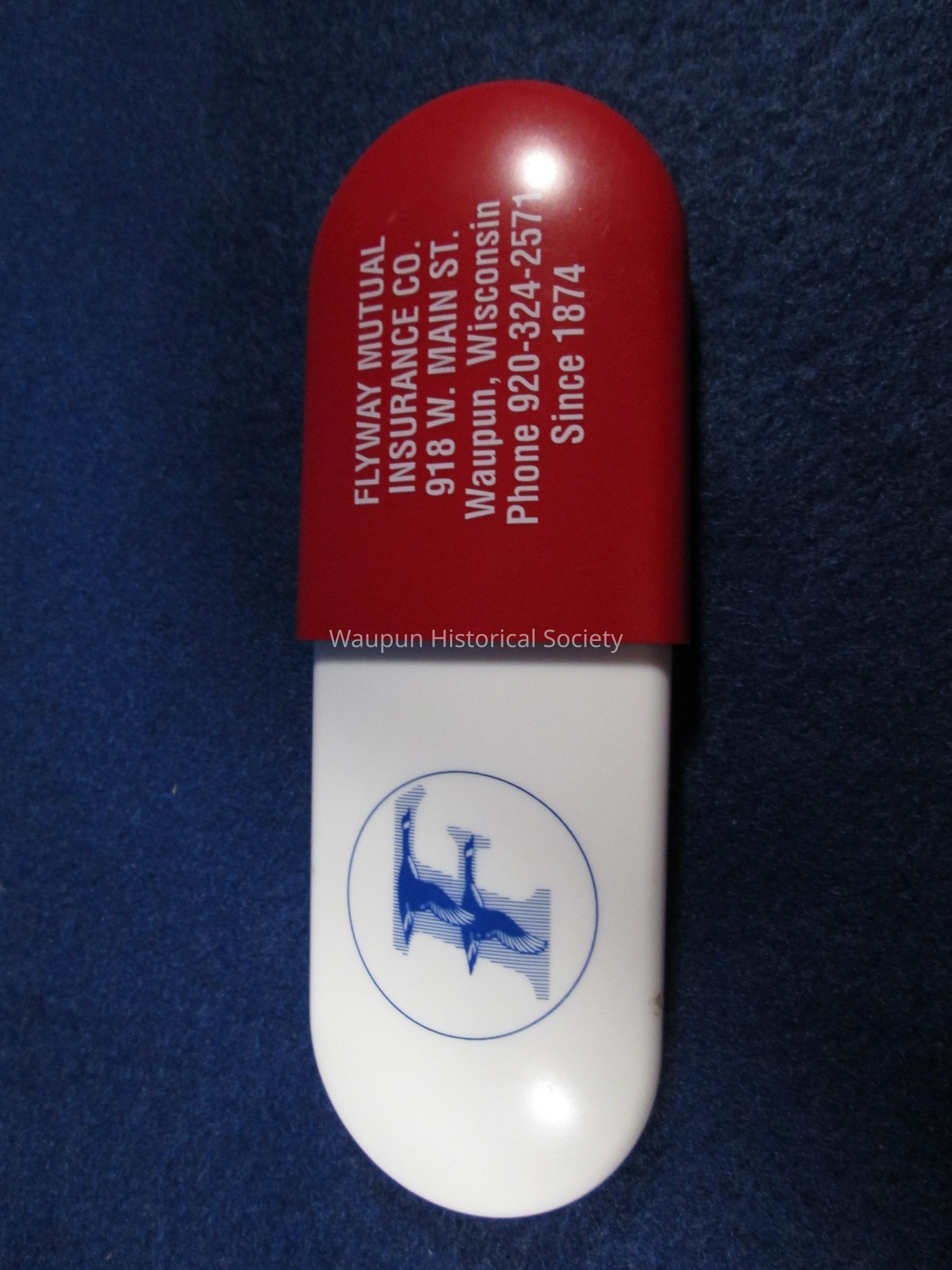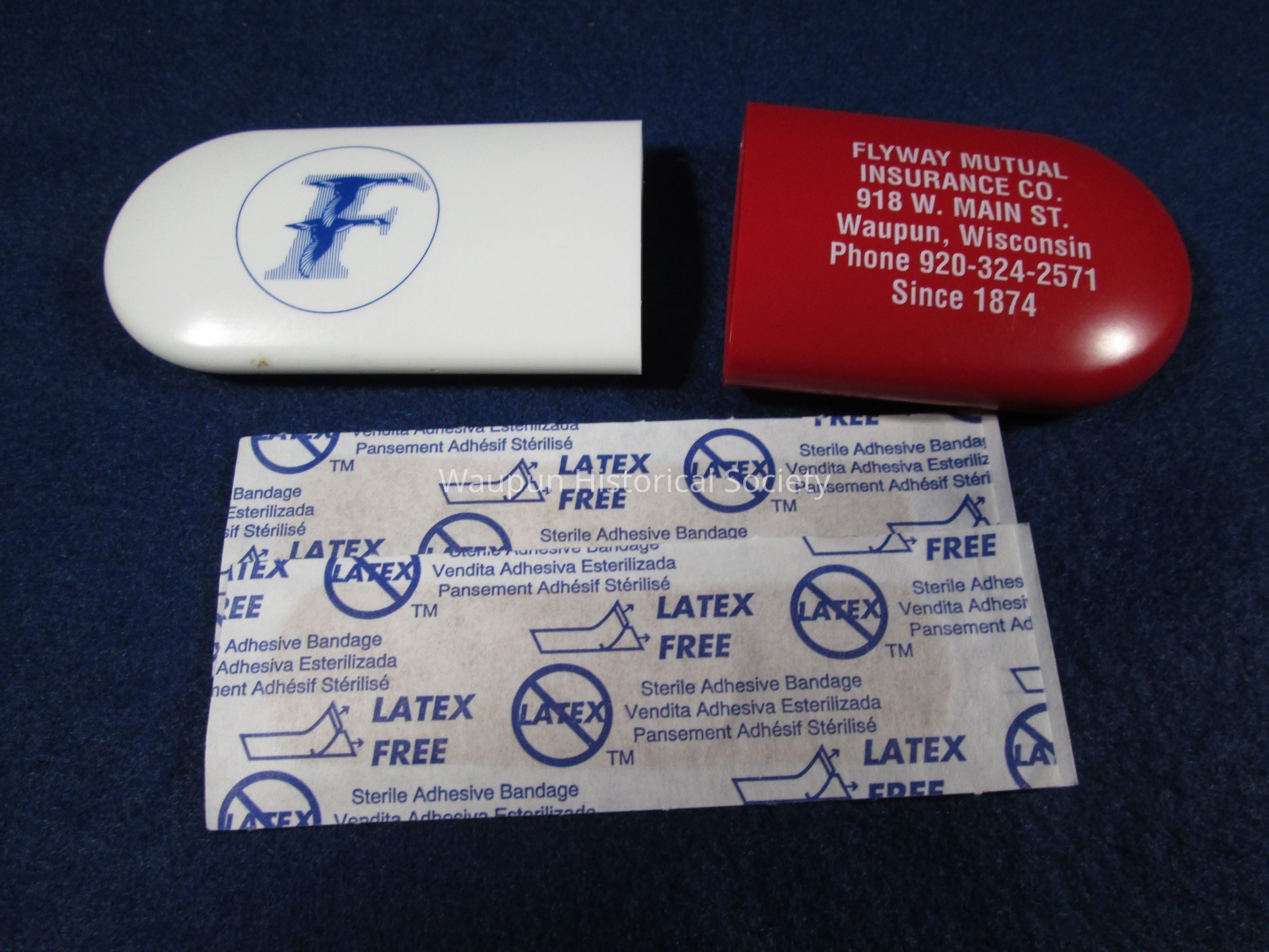 A Bandage Containter That hold Latex Free Bandage that Advertising of Flyway Mutual insurance Co.of 918 W. Main Street Waupun, Wis. Been in business since 1874Acquisition