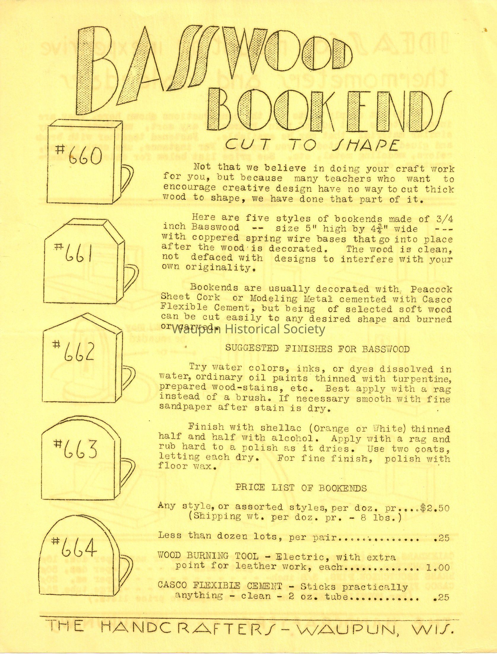 Two sided advertisement released by the Handcrafters of Waupun, date unknown. Typed and printed on yellow paper, suggesting later issue than 1940's.