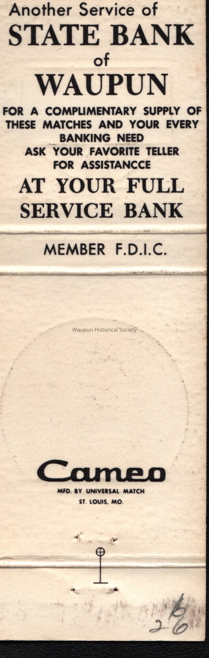 Matchbook, State Bank, Immanuel Lutheran Church